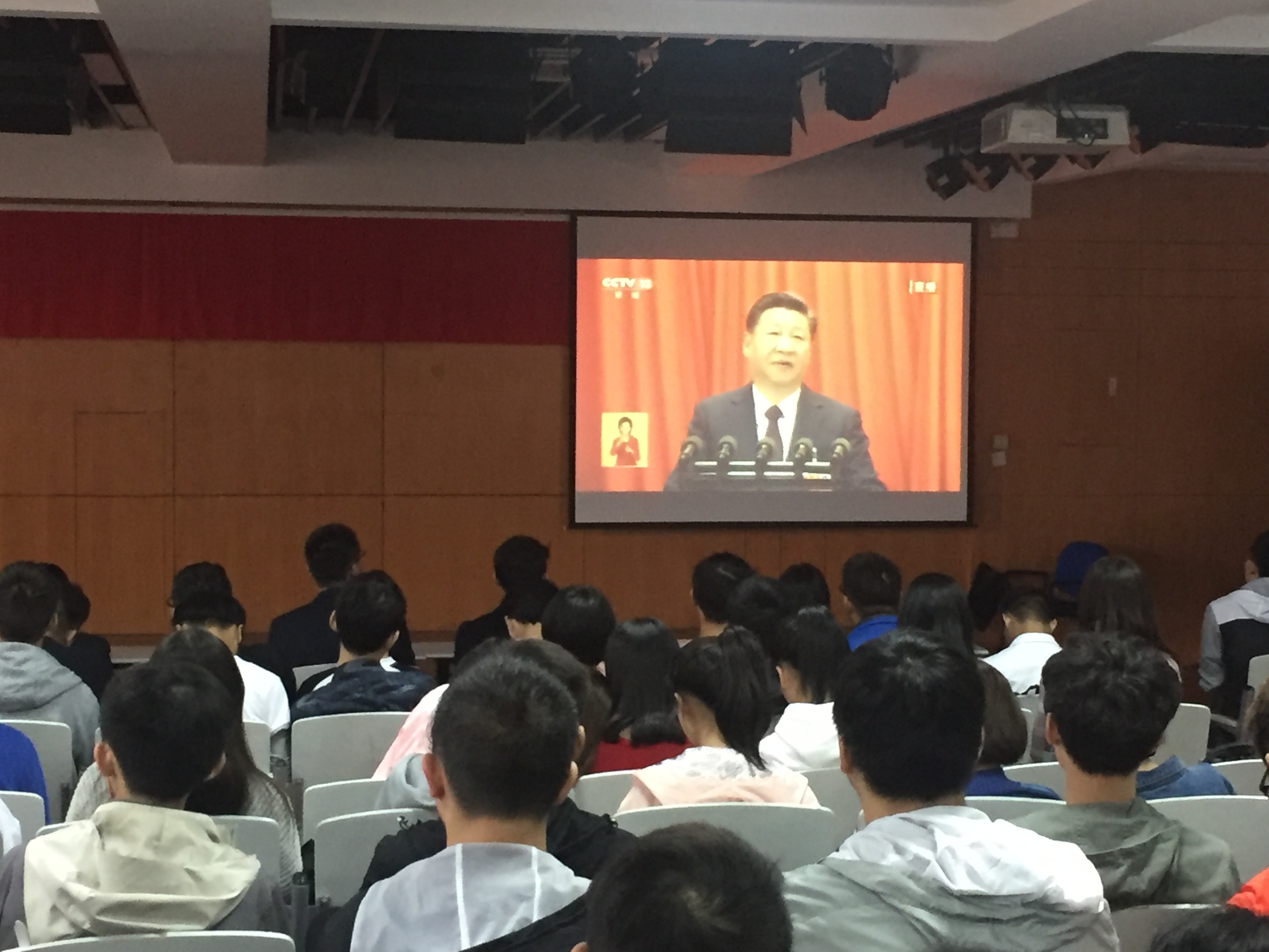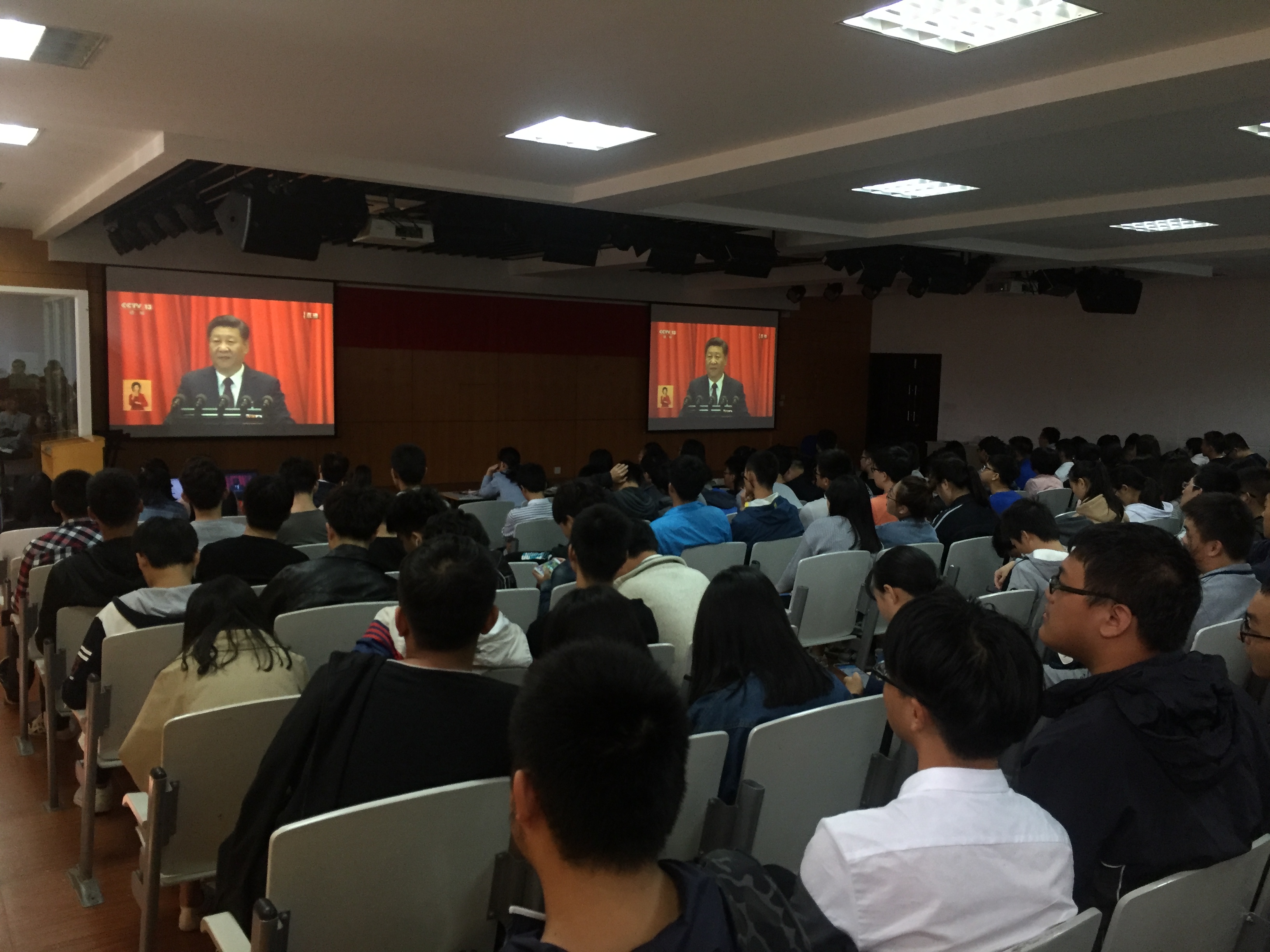10 月 18 日上午9时整,在庄严雄壮的国歌声中,肩负着全党重托和全国人民期盼,举世瞩目的中国共产党第十九次全国代表大会在北京人民大会堂隆重开幕。为了解党的十九大开幕会盛况,及时掌握党的十九大精神,掀起学习贯彻大会精神热潮,通信学院党总支积极响应学校党委号召,发动全院师生通过网络、广播、电视收听收看党的十九大开幕会盛况,并创造条件组织师生代表在I-401集中收看党的十九大开幕会直播。