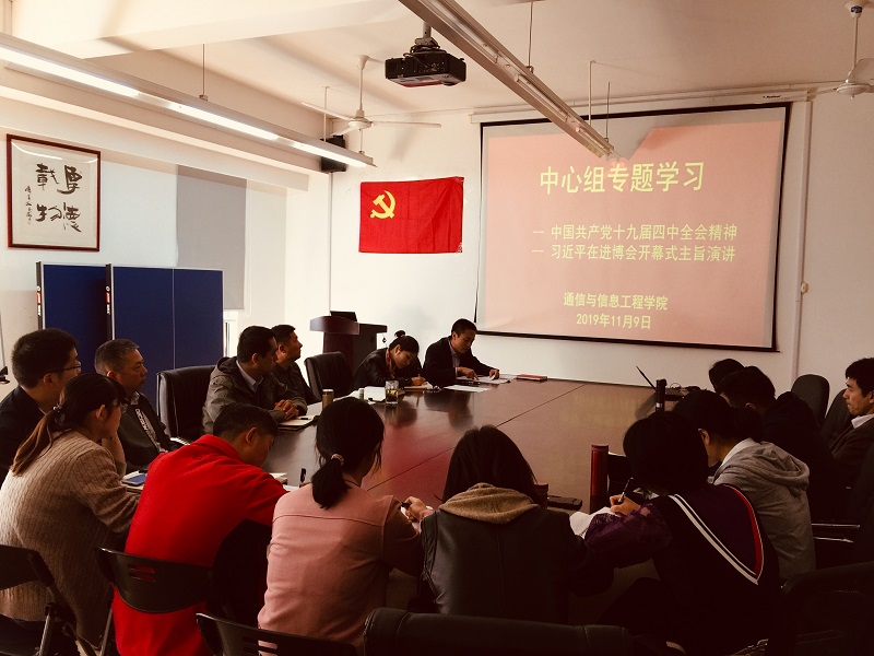 近日,学校党委制定了《学习宣传贯彻党的十九届四中全会精神工作方案》,全面系统部署学校学习党的十九届四中全会精神。通信与信息工程学院党总支积极响应党委号召,把学习领会党的十九届四中全会精神,以及习近平总书记在第二届进博会开幕式上的重要讲话精神,作为“不忘初心、牢记使命”主题教育学习的一项重要内容,于11月9日下午在J313会议室开展中心组专题学习。