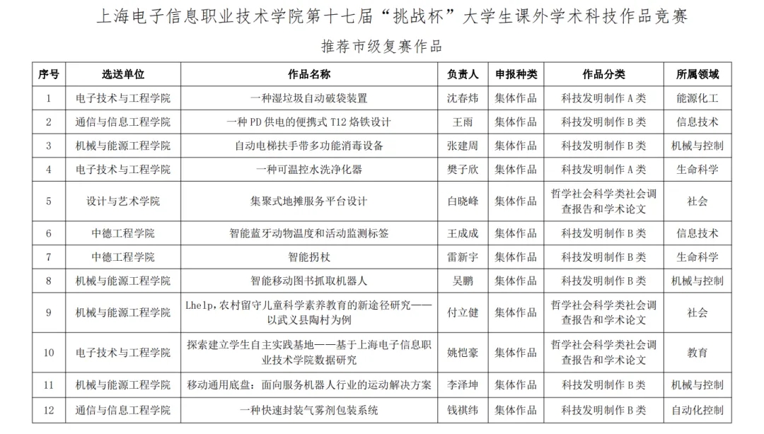 上海电子信息职业技术学院第十七届“挑战杯”全国大学生课外学术科技作品校内竞赛自2021年1月启动以来,得到了全校各二级学院的积极响应,截止至校赛日2021年3月26日,共有35项作品参加校内竞赛。