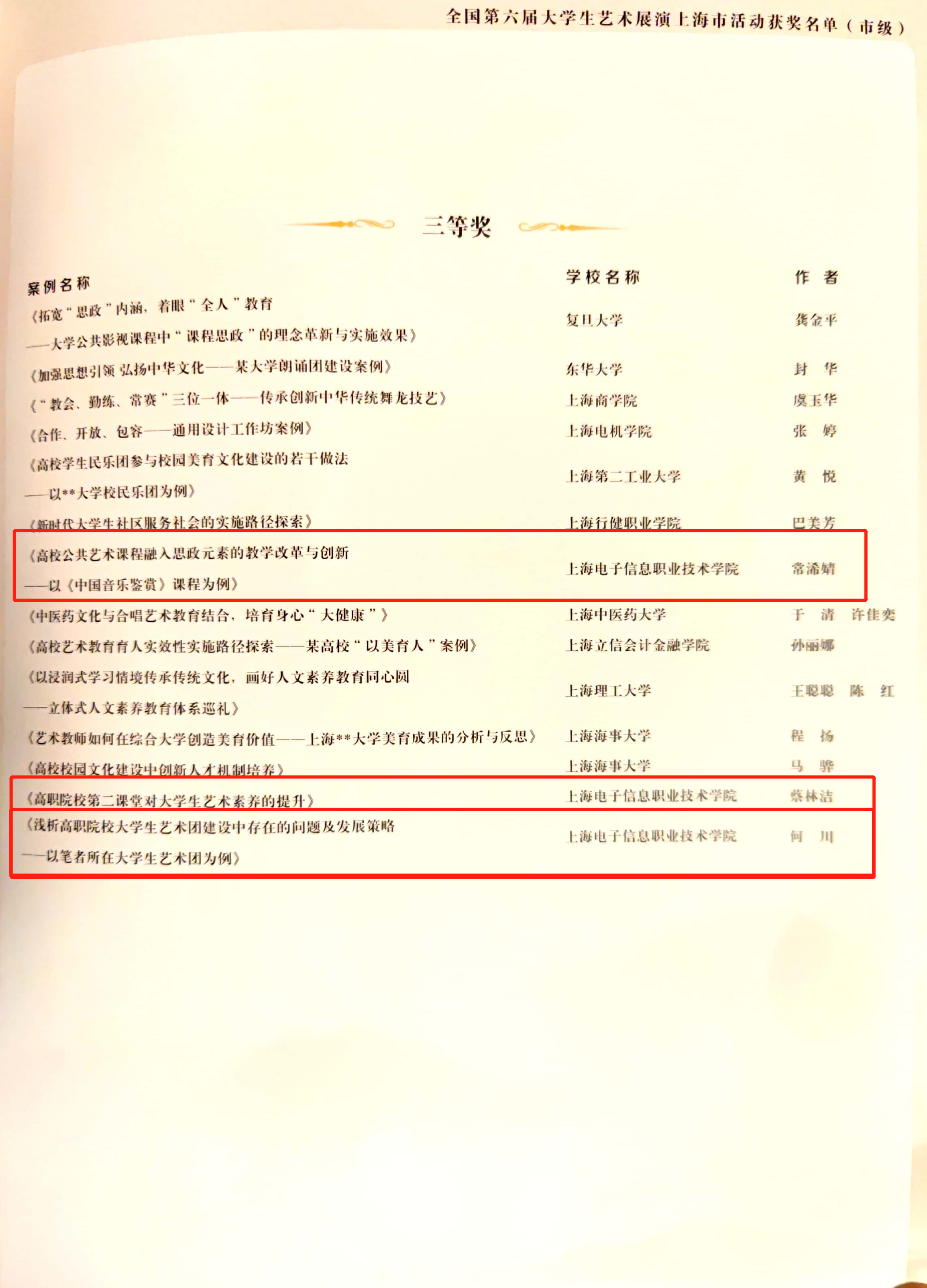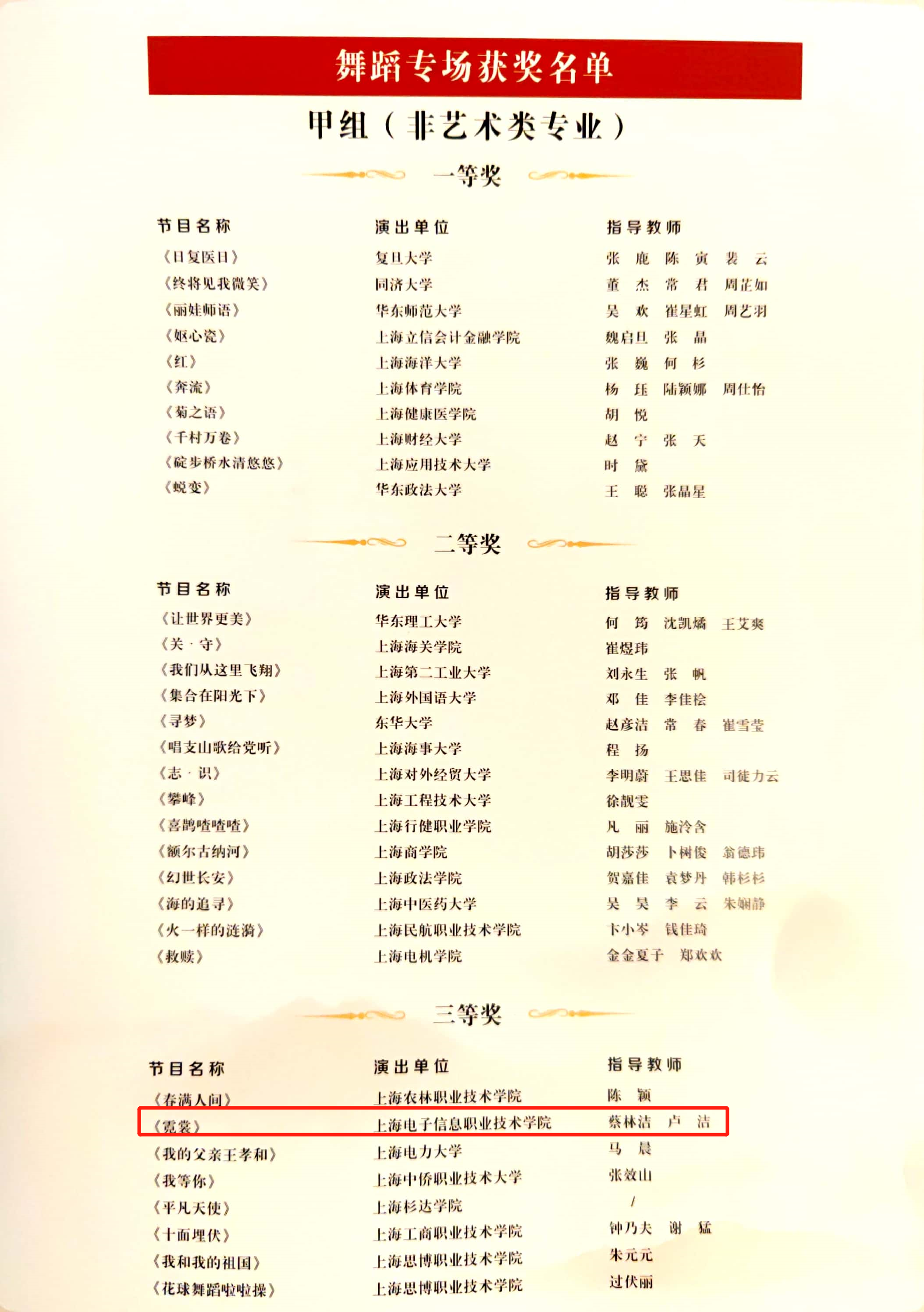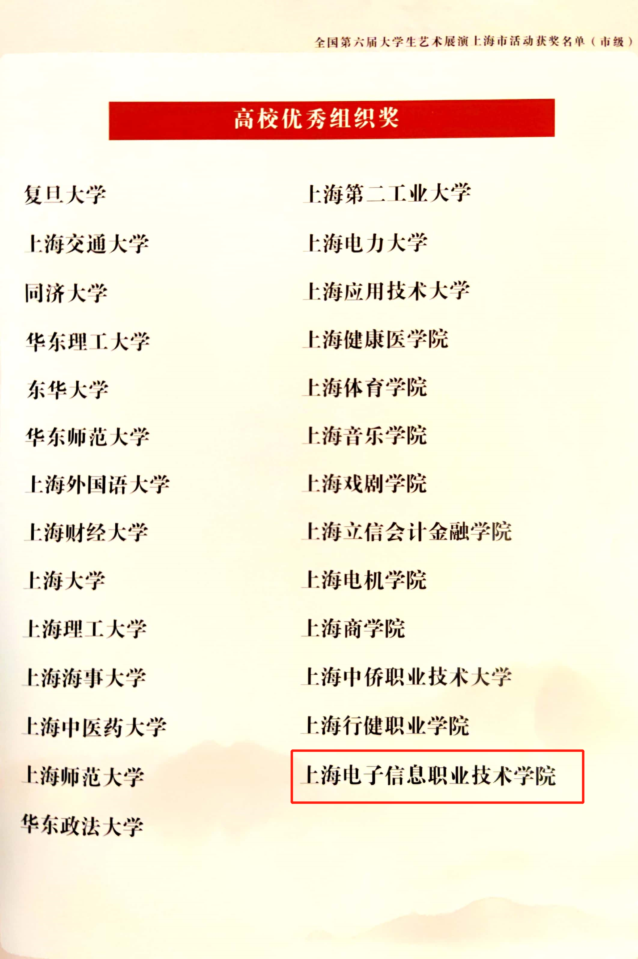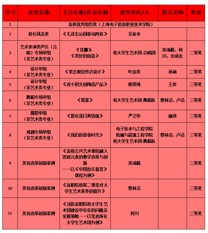 近日,上海市教育委员会公布了第六届全国大学生艺术展演上海赛区活动获奖名单。我校共荣获11个奖项,在上海高职院校中名列前茅。其中,获得高校优秀组织奖1个、校长风采奖1个、其他艺术表演及设计类二等奖2个、三等奖7个。
