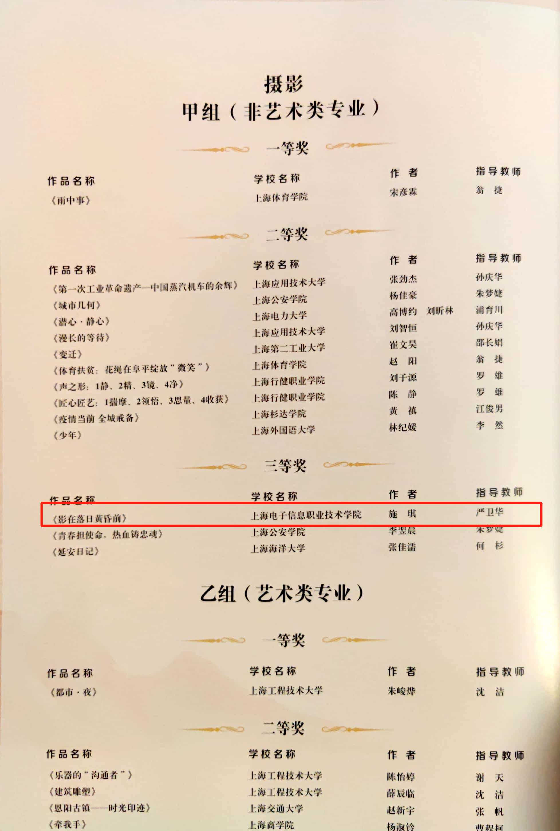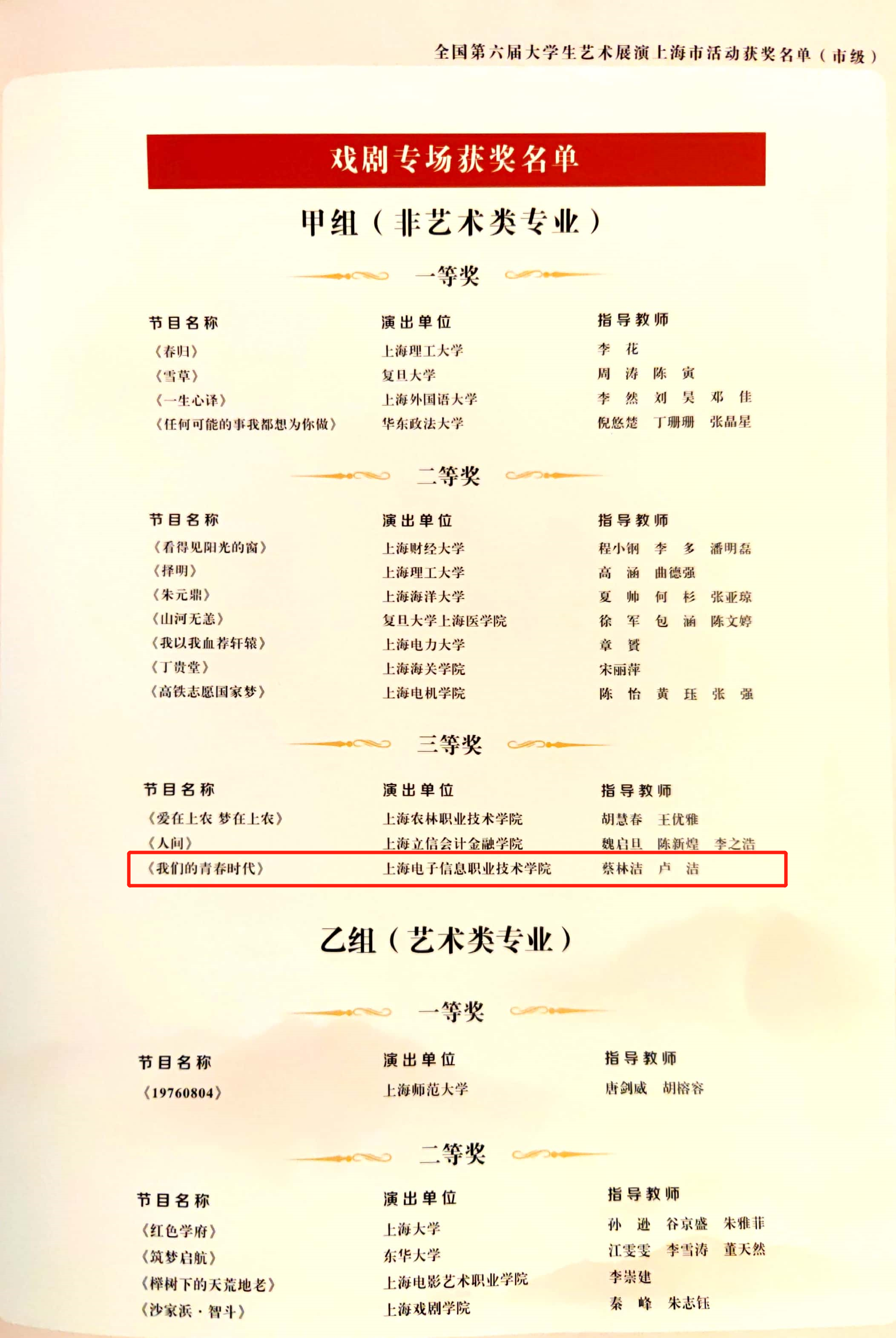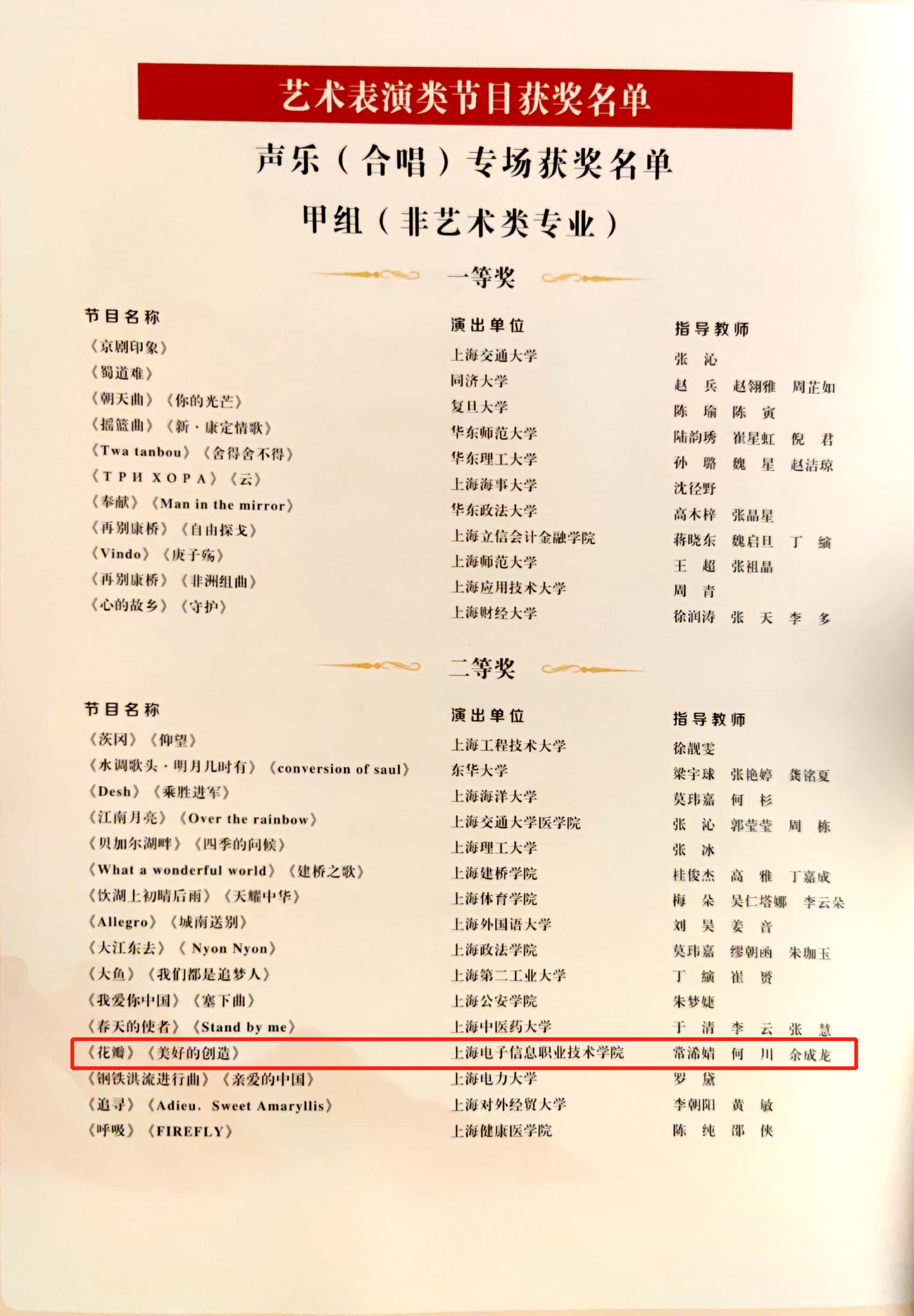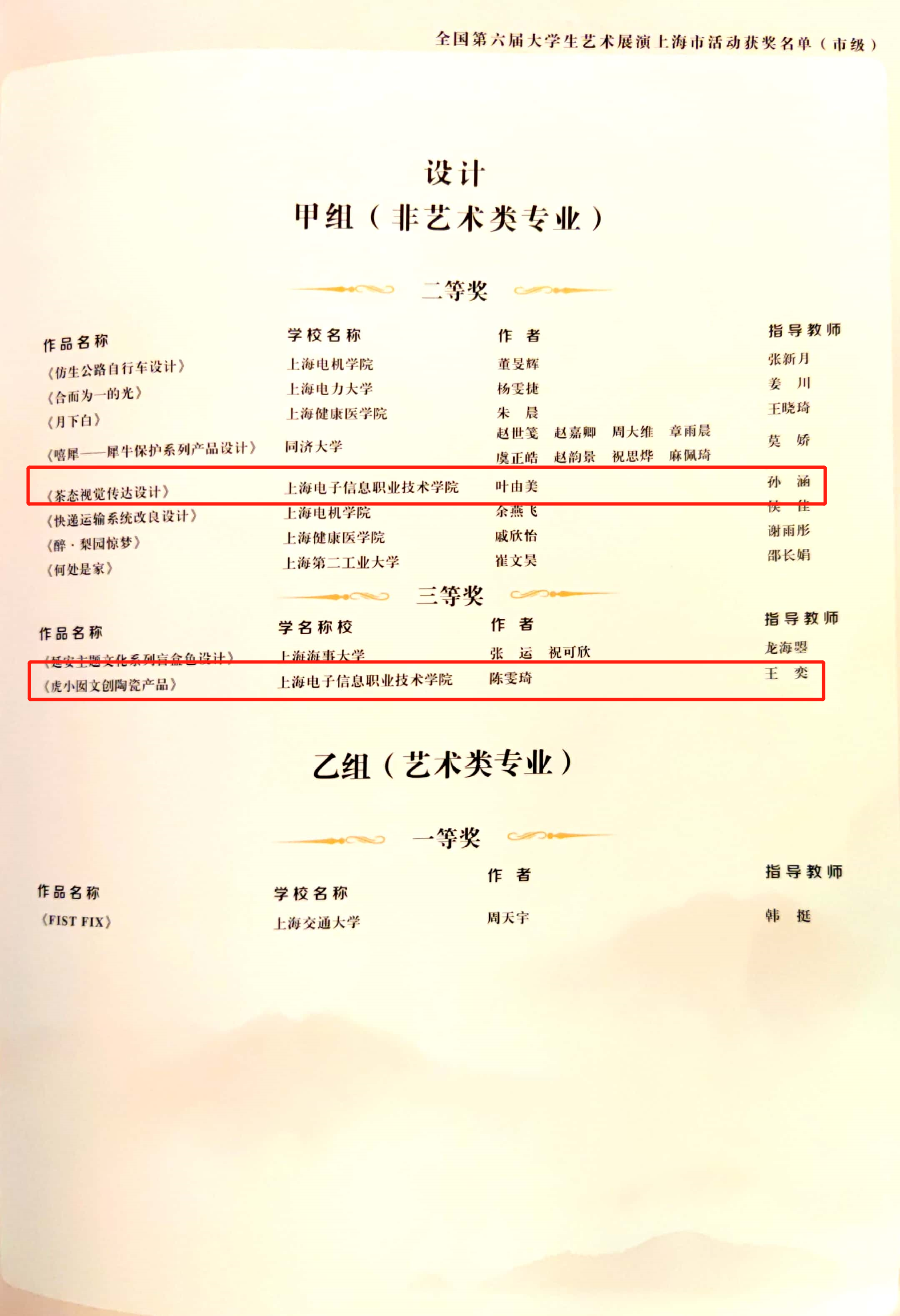 近日,上海市教育委员会公布了第六届全国大学生艺术展演上海赛区活动获奖名单。我校共荣获11个奖项,在上海高职院校中名列前茅。其中,获得高校优秀组织奖1个、校长风采奖1个、其他艺术表演及设计类二等奖2个、三等奖7个。