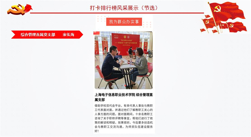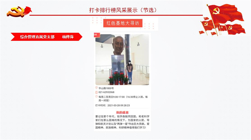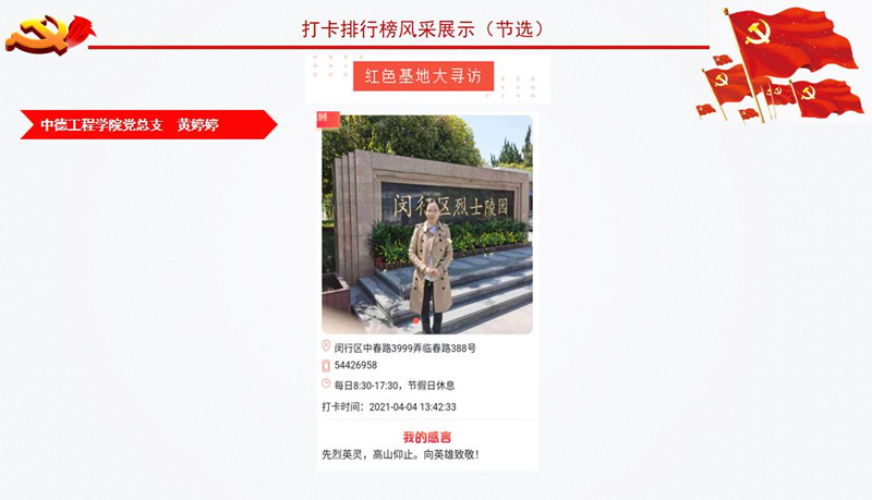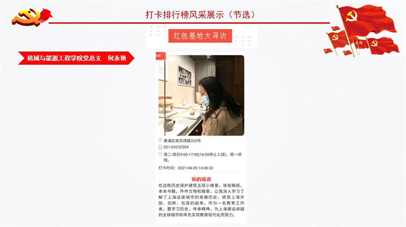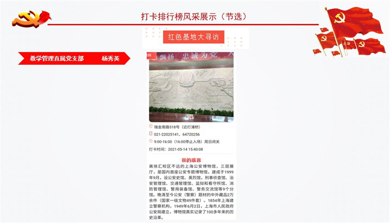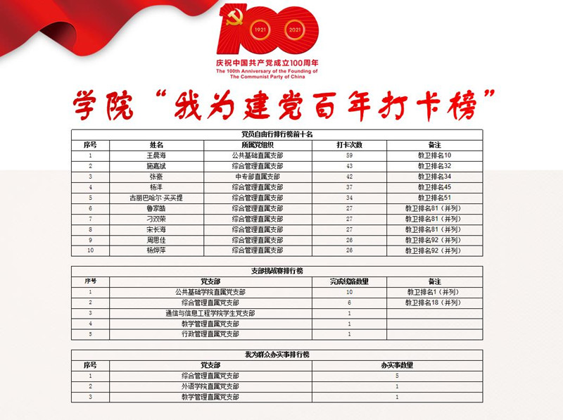 为庆祝中国共产党成立/SPAN>/SPAN>/SPAN>/SPAN>100/SPAN>/SPAN>/SPAN>周年,推进党史学习教育走深走实、取得实效,市教卫工作党委推出“我为建党百年打卡”活动。学校将其作为党史学习教育的重要抓手,掀起了红色教育基地打卡热潮。/SPAN>/SPAN>/SPAN>/SPAN>/SPAN>/P> 我校各基层党组织和广大党员通过打卡活动,深刻铭记中国共产党百年奋斗的光辉历程,感悟党始终不渝为人民的初心宗旨,学史明理、学史增信、学史崇德、学史力行。为了进一步形成“比学赶超”的生动局面和浓厚氛围,以实际行动迎接党的百年华诞,学校推出“我为建党百年打卡榜”。/SPAN>/SPAN>/SPAN>/SPAN>/SPAN>/P> 本次“我为建党百年打卡榜”/FONT>统计数据截至5月30日。快来一起看看/SPAN>/SPAN>/SPAN>/SPAN>/SPAN>都有谁上榜吧!/SPAN>/SPAN>/SPAN>/SPAN>/SPAN>/P> /P> /P> (作者:杨烨萍 供稿:校组织部)/SPAN>/P>