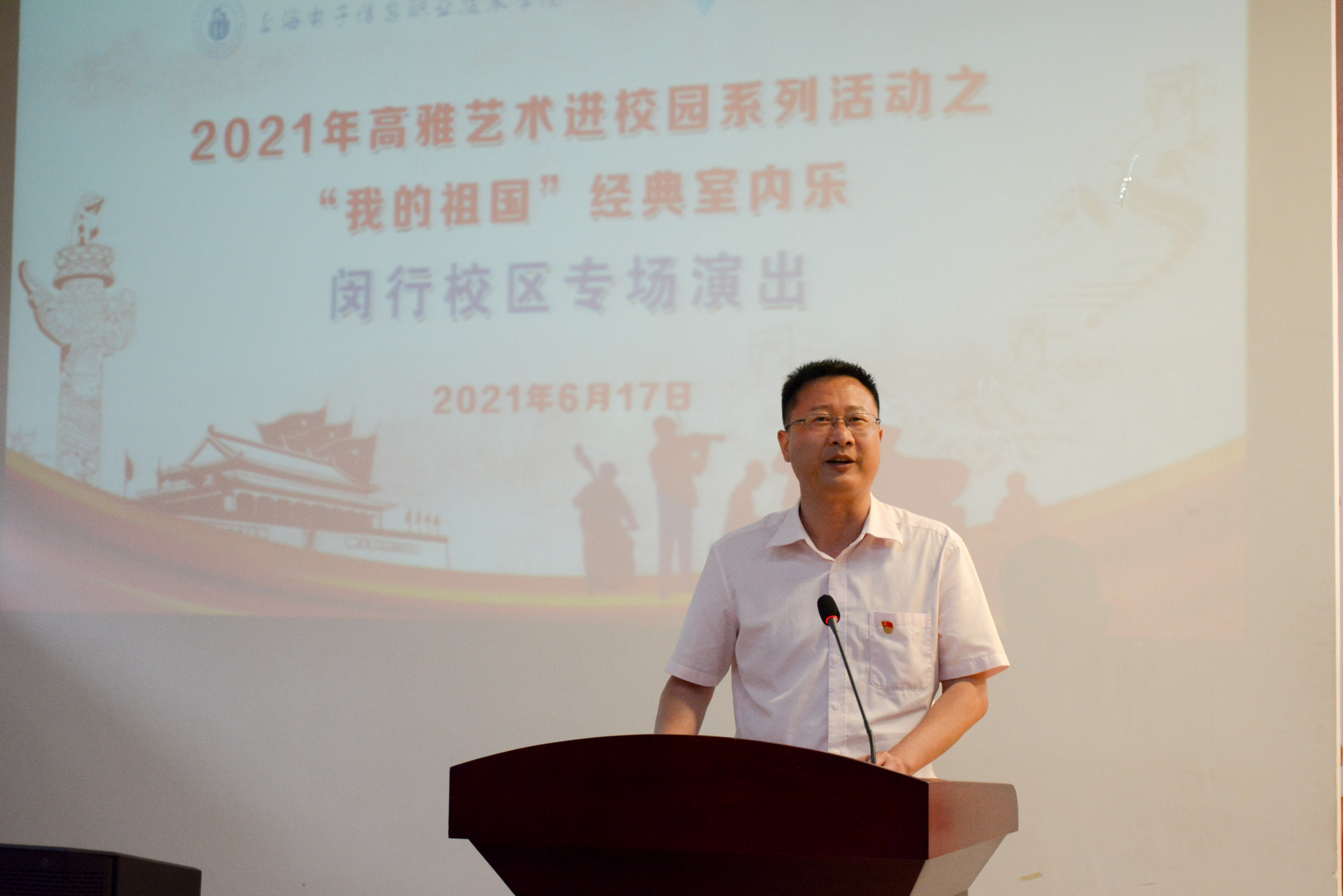 6月17日,我们荣幸的邀请到了华东师范大学音乐学院的老师和同学们带来的室内乐闵行校区专场演出,到场的嘉宾老师有华东师范大学音乐学院副院长、上海音乐家协会钢琴专业委员会副会长张薇; 上海电子信息职业技术学院党委副书记、副校长张涛,上海电子信息职业技术学院教务处副处长兼中专部副主任王晟、上海电子信息职业技术学院电子工程学院副院长兼中专部副主任张帆。校团委书记蔡林洁主持专场演出。