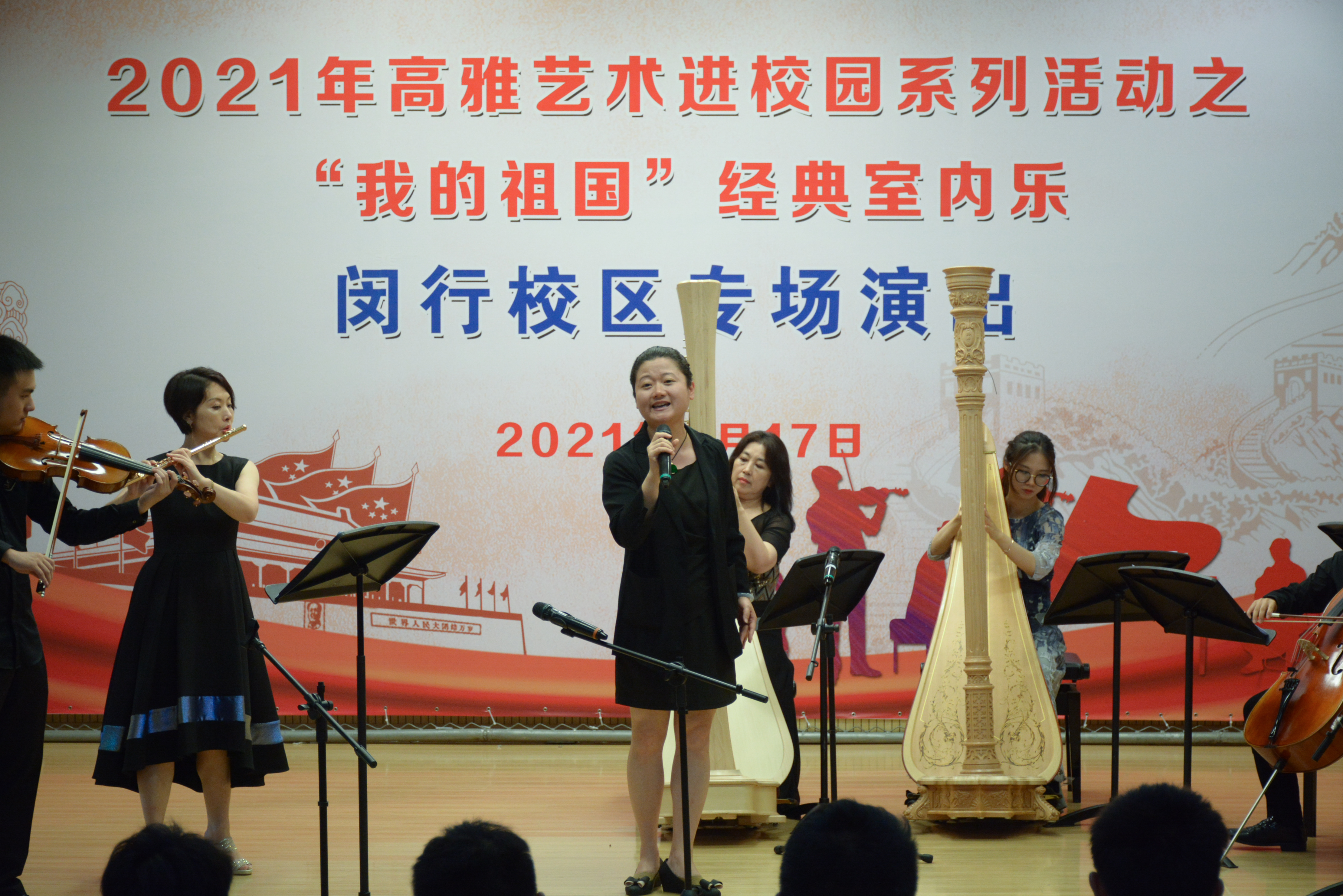 演出开篇是竖琴、弦乐、长笛合奏,与我校蔡林洁老师演唱,共同合作《唱支山歌给党听》,赢得师生喝彩声不断。久石让的《能看见海的街道》和《千与千寻》引起了同学们的热情互动。第四篇章竖琴与木管、弦乐四重奏,包含了两首音乐:《探戈舞曲》和《C大调奏鸣曲》,同学们徜徉在优美的古典乐中,回味无穷。第五篇章长笛、双簧管与竖琴三重奏选自歌剧《茶花女》,是意大利作曲家威尔第作曲的三幕歌剧,该歌剧是全世界最常被演出的歌剧。电影《渔光曲》主题曲,使用竖琴、长笛进行演奏,这首曲目深情地演绎出了旧社会长年漂泊在海上的穷苦渔民的艰辛劳动生活,真实地反映了渔民们愁苦困顿的心情。最后,气势磅礴的管弦乐作品歌剧《白毛女》选段《北风吹》,乐曲震撼人心;《我的祖国》更是带动了现场同学们齐声歌唱,反响热烈。如此多的经典曲目演出,可谓是大饱耳福,带给了师生们一场绝佳的视听盛宴。