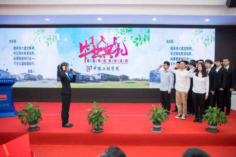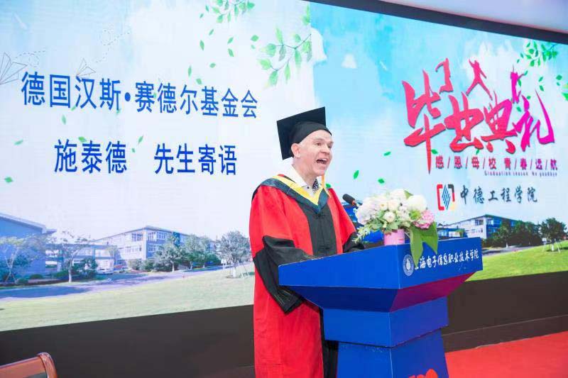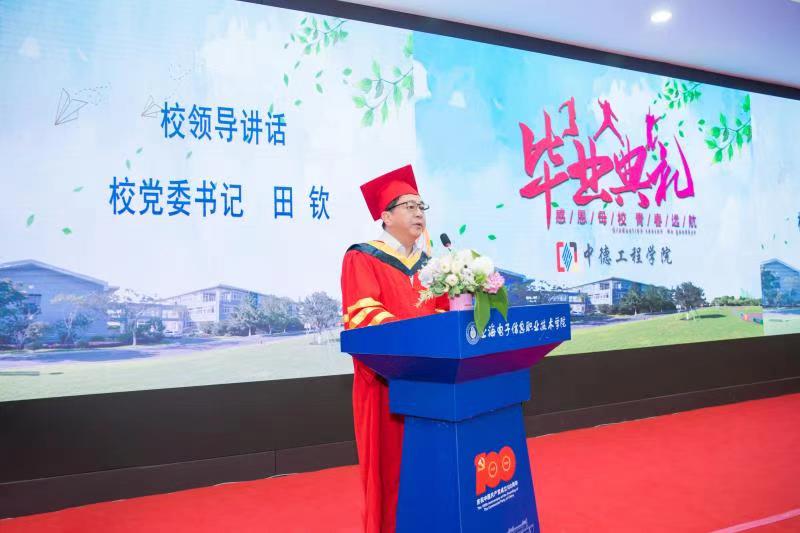 建党百年初心不移,中德学子扬帆起航。/SPAN>7月2日下午,中德工程学院2021届学生毕业典礼在学校C108报告厅隆重举行。学校党委书记田钦、德国汉斯•赛德尔基金会上海代表处首席代表、中德合作项目负责人施泰德,党委副书记、副校长张涛、学工部副部长栾文飞、教务处副处长王西贝、中德工程学院党政负责人、全体教师及2021届学生出席毕业典礼。/SPAN>/SPAN>/P> 会上,师生共同观看了毕业生短片/SPAN>——《悸忆留夏,恣意青春岁月;情谊永痕,携手梦圆芳华》。优秀毕业生代表戴朗丞同学,带着感恩之心与毕业生一起回忆母校的细心栽培、老师的默默支持、同学的包容合作。教师代表嵇丽丽、辅导员代表王爽勉励即将踏上新征途的毕业学子们永记奋斗之志,永存学习之意,树立远大的目标,心怀鸿鹄之志,一往无前。/SPAN>/SPAN>/P> 田钦书记和施泰德先生为毕业生颁发德国技术员证书,教务处副处长王西贝、学工部副部长栾文飞、学院党政领导、教师代表向/SPAN>2021届学生代表颁发毕业证书,毕业生为表达对母校的深情厚谊向学校捐赠毕业林树木。/SPAN>/SPAN>/P> /P> 德国汉斯/SPAN>•赛德尔基金会上海代表处首席代表、中德合作项目负责人施泰德先生寄语毕业学子,希望能始终葆有终身学习的态度,不懈努力,勇于担负起时代的使命,成为对社会有贡献的人。/SPAN>/P> 田钦书记向所有毕业生表示热烈祝贺,并对同学们提出六点建议:坚守信仰、勇敢追梦、勇于担当、学会感恩、心存敬畏、强健身心。勉励毕业生要以实现中华民族伟大复兴为己任,增强做中国人的志气、骨气、底气,不负时代,不负韶华,不负党和人民的殷切期望!/SPAN>/P> 全体毕业生郑重宣誓:继承伟大建党精神,牢记母校教育培养;尚德修能,知行合一,不负众望,砥砺前行。/SPAN>/SPAN>/P> 2021届学生毕业典礼在教师和毕业生代表悠扬的歌声中,隆重落幕。(供稿:中德工程学院)/SPAN>/SPAN>/P>
