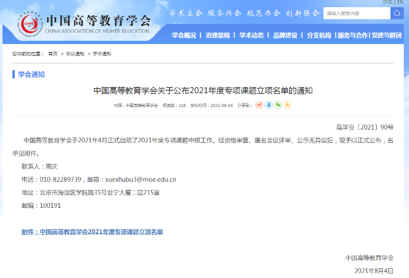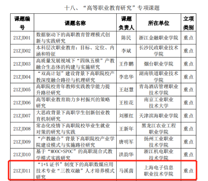 中国高等教育学会于/span>8/span>月/span>4/span>日发布/span>2021/span>年度专项课题立项通知。我校设计与艺术学院马溪茵老师的《“/span>1+X/span>证书”制度下的高职数媒应用技术专业“三教双融”人才培养模式研究》获批重点项目,学校办公室李旺老师的《高职院校健全“四体一位”内部治理体系的实践研究》获批一般项目。/span>/span>/p> 根据本次项目申报要求,我校限额上报两项,且均获批立项。(供稿单位:科研处)/span>/p> /span>/p>