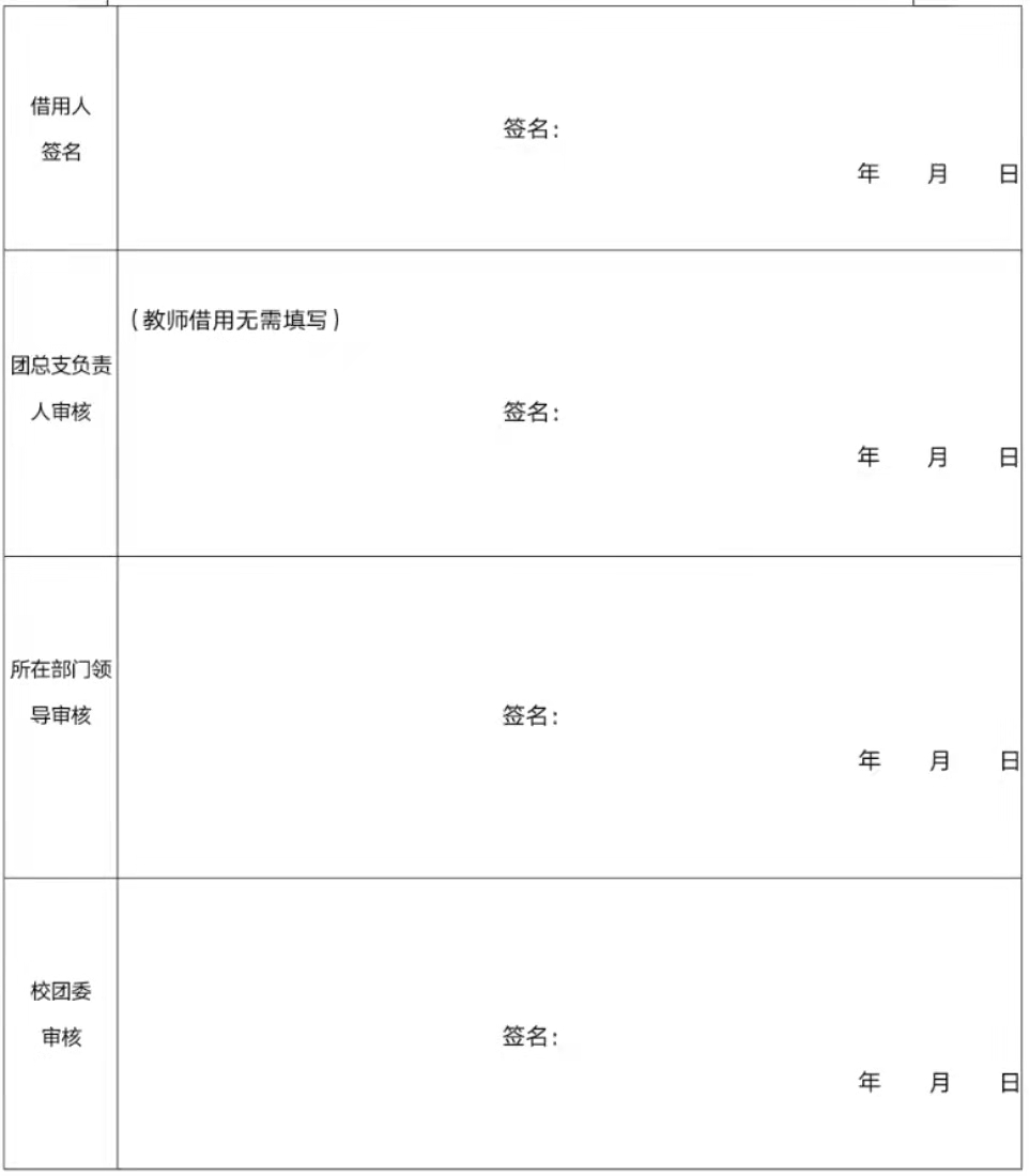 备注:/span>/span>/span>/p> 1./span> /span>/span>校团委每周一至周五 /span>12:00/span>——/span>13:00/span>办理租借审批、归还业务。 2.请提前一天交表至校团委审核,审核通过后由勤工俭学同学配货,次日领取租借物品。/span>/p> 3.租借物品按照规定的时间验收合格后需双方签字后完成租借流程。/span>/p> 4.联系方式:/span>57131333-16781/span>/span>/span>/p>