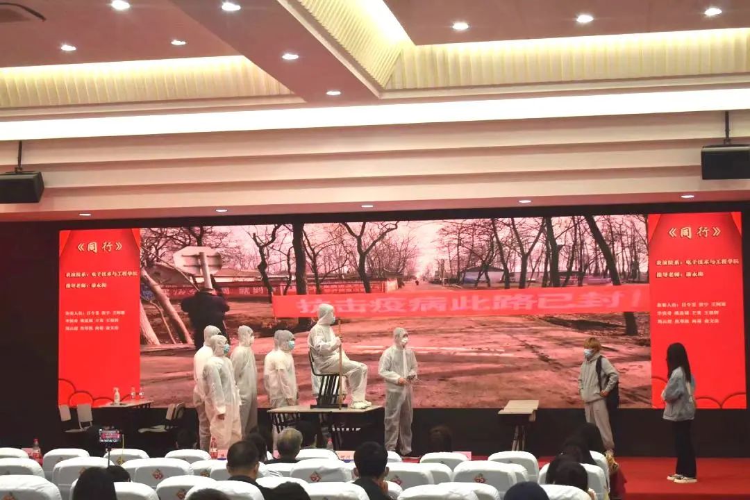本次参赛的共有10支队伍,其中有一支队伍来自闵行校区,他们把中国共产党历经风雨洗礼,从无到有、由弱到强的一幕幕重要历史瞬间搬上了舞台。不仅有致敬先辈的《黎明不晚》《一颗改变中国命运的种子》,有激人奋进的《我们的1919》《恢复高考》,勉励新青年不忘初心、砥砺前行的《时代殷殷嘱托 青年勉励前行》,还有万众一心共同抗疫的《新冠疫情——乌龙快递》《同行》等节目。节目采用LED屏将演员和场景巧妙的融为一体,演员们倾情的演绎、感人肺腑的故事情节使所有观众为之动容。