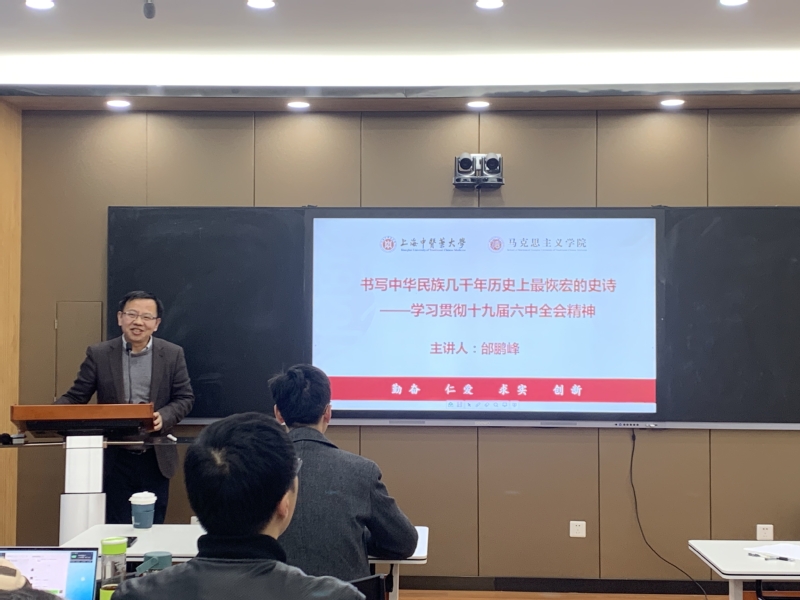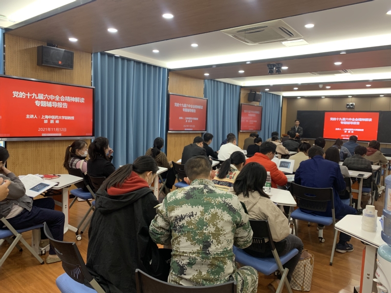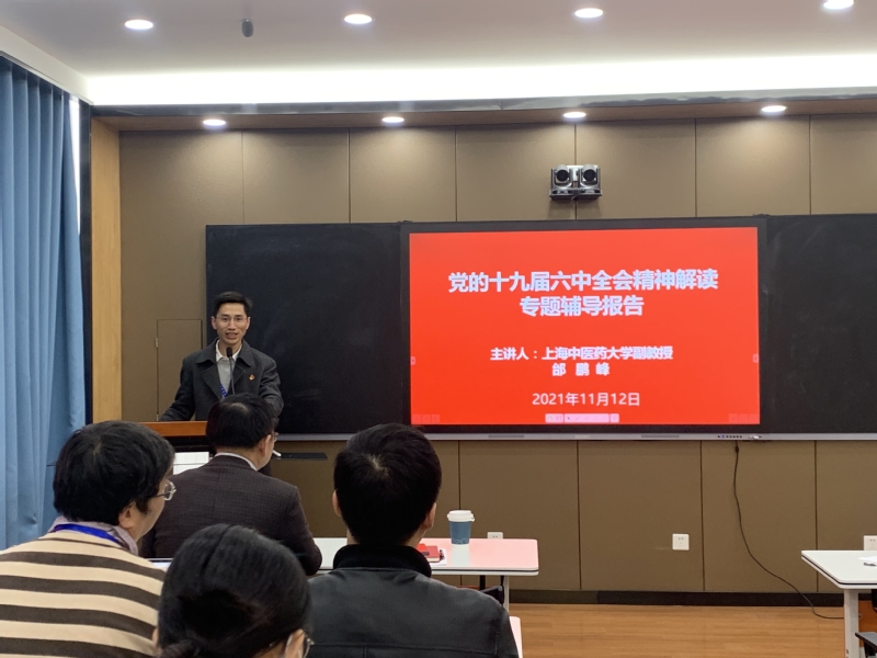 11月12日,中专部直属党支部在闵行校区C211会议室举行“深入学习贯彻党的十九届六中全会精神”主题党日活动。上海中医药大学副教授邰鹏峰受邀以“书写中华民族几千年历史上最恢弘的史诗”为题为全体党员作专题辅导报告。中专部直属党支部全体党员共同参加学习,报告会由党委宣传部副部长、中专部直属党支部副书记张贯彻主持。/P>