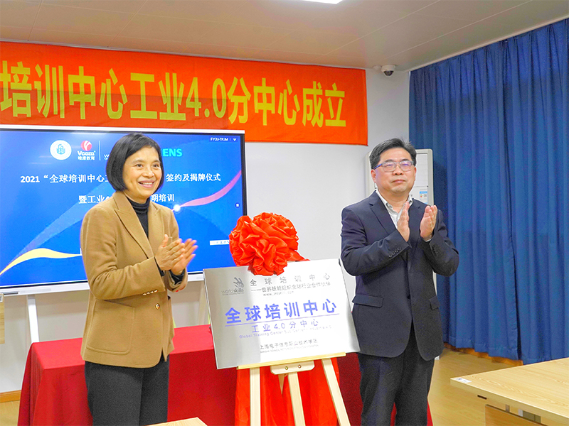 上海市教育委员会副主任毛丽娟与上海市人力资源和社会保障局副局长、世赛执行局副局长张岚共同为“全球培训中心工业4.0分中心”揭牌。