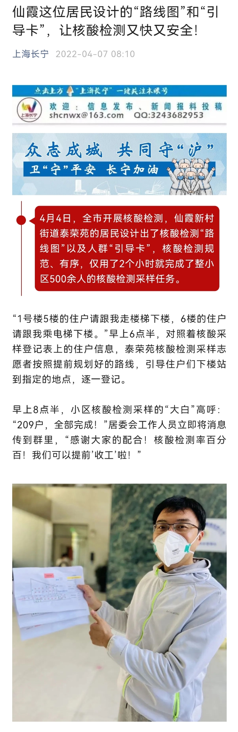3月27日张帆老师回到家后,与他、爱人一起又立即报名参加所在社区仙霞新村街道泰荣苑的志愿者工作。他考虑到泰荣苑的楼层比较高,每号楼都有30层,每层3到4户人家,在疫情期间,高楼层住户乘坐电梯下楼时可能会出现人群拥挤的情况。在核酸检测的前一晚,张老师设计了核酸检测“路线图”以及人群引导卡片。第二天还在大厅内贴上了引导地贴,用于人群分流,并且修改了电梯乘坐流程。实践证明,以往在等待电梯、引导人群等环节都花费了较多的时间,而此次“路线图”实行以来,居民们发现核酸检测现场井然有序,路线分明,速度也提高了一倍,仅用了2个小时就完成了整小区500余人的核酸检测采样任务。这些优化措施起到了良好的作用,普遍受到居民和志愿者的好评,大家都看到张帆老师都翘起大拇指说:“张老师你这个方案真的非常好!”居委干部也将优化方案推广到长宁区的其他小区,取得了满意的效果。在4月7日“上海长宁”微信公众号上,专门报道了张帆老师的先进事迹。