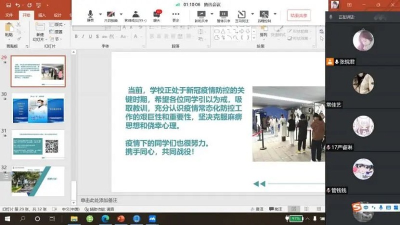 为进一步做好校园严格准封闭管理期间学生管理工作,引导广大学生正确认识当前复杂严峻的疫情形势,有效增强严格准封闭管理期间学生的思想教育和价值引领,维护正常的校园秩序,学工部组织开展/span>“严格准封闭管理期间我们怎么做”主题教育活动。/span>/span>/p> /span>/span>/p> /span>/span>辅导员通过召开线上主题班会、走访宿舍等方式,以/span>“严格准封闭管理期间我们怎么做”为主题,围绕“当前新冠肺炎疫情防控形势”“学校疫情防控总体情况”“校园防疫工作井然有序”“同心战‘疫’战胜疫情”四个方面,号召全体学生,在校园严格准封闭管理期间要认真遵守学校有关规定,配合学校,与学校同频共振,共同努力,做好疫情防范工作,坚决打赢校园疫情防控阻击战。/span>/span>/p> /span>/span>/p> 根据上海市疫情防控工作统一部署,学校实行严格准封闭管理。严格准/span>封闭管理期间,电子技术与工程学院学生工作团队继续奋战在抗疫一线。/span>学院对全体学生开展了严格准封闭期管理的主题教育活动,主题教育中,每位辅导员都将学校统一的严格准封闭期间我们怎么做给同学们作了讲解。/span>/p> /span>/p> 本次主题班会活动对上海当前的疫情情况进行了具体的分析,通信与信息工程学院辅导员引导学生正确认识疫情,科学地做好各项防疫工作,并对学生进行了心理疏导,鼓励学生增强抗击疫情的信心。本次主题班会再次倡导同学们在宿舍认真参加线上学习,合理地安排好学习和生活,坚持防疫学习两手抓。另外,在严格准封闭管理期间,再次强调严禁外卖进校和私自接收外来物品、暂停快递服务、开通/span>“生命通道”。疫情虽然可怕,但是老师们一直与同学们同在,志愿者们一直与同学们同在,医务人员一直与同学们同在。希望各位同学在严格准封闭期间也能保持好良好的身心健康,做好个人的防护工作,锻炼好自己的身体,相信我们一定会战胜疫情。/span>/span>/p> /span>/span>/p> 为全面落实学校疫情防控工作要求,打好疫情防控阻击战,保障全院学生健康安全,守护校园,维护校园安全稳定良好局面,机械与能源工程学院组织全体辅导员在各班开展了/span>“携手同心、共同战疫”主题教育工作。我院党总支副书记、副院长倪娜,带领辅导员尹立军、高文萍老师深入学生宿舍,围绕“严格准封闭管理期间我们怎么做”主题,给同学们讲解了当前新冠肺炎疫情防控形势,以及学校目前疫情防控总体情况。随后,倪娜老师与学生进行了深入交谈,详细了解学生在校情况以及学习、生活等方面存在的困难,嘱咐学生做好自我调节。班会最后,同学们纷纷表示:一定严格遵守学校严格准封闭管理的各项疫情防控规定,坚决杜绝外卖和快递。/span>/span>/p> /span>/span>/p> 经济与管理学院辅导员纷纷通过腾讯会议,开展了以/span>“严格准封闭管理期间我们怎么做”为主题的班会,辅导员老师们从当前上海市新冠肺炎疫情防控形势,结合我校实际情况,围绕从线上教学、网格化管理、校内师生核酸检测、严格准封闭期间生活园区管理、应急处置等五个方面介绍了学校疫情防控总体情况,为同学们讲解了当前我们面临的疫情形势,让同学们深刻认识目前疫情防控的重要性。针对严格准封闭管理期间同学们上课、就餐、洗浴、运动、就医等各方面问题给予详细的解答。同时,向同学们展示了高校发生的典型预警案例,再一次让同学们深刻认识疫情防控的严肃性,引导同学们遵守疫情防控形势下学校的各项规章制度,树立责任意识,配合学校疫情防控工作。/span>/span>/p> /span>/span>/p> 为保障全体师生的生命健康安全和巩固前一阶段学校取得的防疫成果,中德工程学院全体辅导员为学院学生,尤其是在校学生,通过各种方式召开了主题班会。班会上,辅导员讲清形势,说透政策,引导方向,聆听需求,倡导师生关爱自己、保持卫生、拒绝网购、避免外界接触等,为有效贯彻学校和学院的抗疫政策措施,开展了大量一线工作和有效宣传。特殊时期的特殊班会取得了良好的效果,中德学子纷纷表示理解并遵守学校有关规定政策,为共同守护校园和守/span>“沪”做出青年大学生自己的力量。更有不少同学当场报名志愿者,做出表率。/span>/span>/p> /span>/span>/p> 为了让同学们了解学校严格准封闭管理期间学生管理各项规定,设计与艺术学院组织全体辅导员召开线上班会。辅导员老师们从上海当前新冠肺炎疫情防控形势、学校疫情防控总体情况、校园防疫工作成果、疫情防控案例警示教育等四方面内容帮助同学们积极适应新形势下的校园生活。其中,针对同学们在严格准封闭管理情况下可能会出现的一些心理不适情况,大家通过观看学校心理健康教育咨询中心《守护/span>“疫”心》的小视频也学到了一些小妙招,避免因疫情防控期间不规律的作息或心理等原因而影响自身正常的学习和生活。班会的召开及时让同学们了解到了上海市及学校疫情防控的安排部署,为同学们答疑解惑,大家都认真聆听,同学们表示,将会遵守学校疫情防控规定,努力适应严格准封闭管理下的校园生活,与学校同向同行,共赴时艰,期待乌云散去,春暖花开! /span>/span>/p> /strong>外语学院根据学校疫情防控工作要求,开展了/span>“严格准封闭管理期间我们怎么做”网络主题班会,主要从当前新冠肺炎疫情防控形势、学校疫情防控总体情况、校园防疫