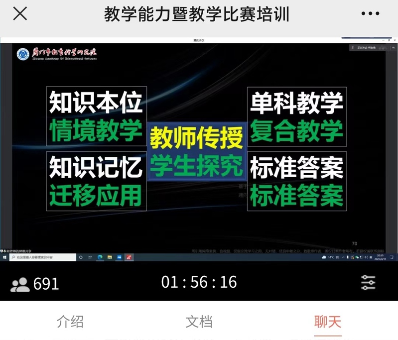 在答疑环节,两位专家耐心针对各位老师提出的有关教学反思改进、信息化手段使用、课程思政设计,以及教学增值评价等方面问题进行答疑解惑。培训一直持续到晚上9点40分,好评如潮。活动的成功举办,为我校教师教育教学能力提升起到了一定的推动作用。(供稿单位:公共基础学院)
