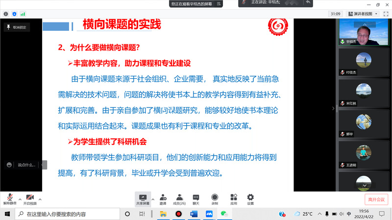 为进一步推动产教融合,提高教师为企业服务的能力,拓展教师关于横向课题方面的专业知识,4月22日,机械与能源工程学院特邀请上海电机学院辛绍杰教授开展“横向研究课题的实践与思考”线上学术讲座。会议由米红林院长主持,学院教师30余人参加学习。/span>/p> 辛教授首先介绍了开展横向课题研究的多方面收获,指出教师可以通过哪些渠道来获取横向课题以及后续做好课题的主要工作环节。辛教授结合自身的课题研究经历谈了切身体会,强调要有耐心地“推销”自己能够为企业服务的本领,研究团队应根据自身技术优势找准适合的项目并进行深入融合,推动课题更好地、可持续发展。辛教授还对学院开展横向课题的思路进行了指导。/p> 本次讲座使机械与能源工程学院教师更为深刻地体会到开展横向课题研究的意义,特别是对如何开展课题、怎样开展课题、如何延续新的课题等难点问题有了新的认识。同时,本讲座对机械学院进一步服务上海临港新片区、奉贤区以及长三角区域产业需求具有重要的意义。(供稿人:付佳杰 供稿单位:机械与能源工程学院)/span>/p>