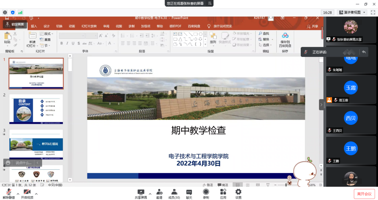 4月30日,教务处召开期中教学检查/span>线上/span>汇报交流/span>会。教务处处长陈克明、二级学院教学院长与教务秘书等相关人员/span>参加了会议/span>,/span>会议由/span>教务处副处长周玉霞/span>主持。/span> /span>/p> 会上,/span>针对/span>在之前/span>2021-2022学年第二学期期中教学/span>检查中发现/span>的/span>各类/span>问题,各/span>二级学院教学院长/span>从/span>教学运行情况/span>、/span>教学运行成效/span>、/span>存在主要问题/span>的/span>原因分析/span>与/span>解决对策/span>、/span>意见与建议/span>等多/span>个方面/span>作/span>了详细的/span>汇报,并/span>对/span>我校本学期开学以来教学的整体状况/span>、教学管理/span>与/span>教学质量、/span>保证教学各环节的正常运行/span>的方式/span>等方面/span>进行了进一步的交流。/span>/p> /span>/p> 教务处处长陈克明指出:第一,教学检查不是目的,只是手段,最终目的是提高学校教学质量;第二,学生是学校的未来,学校教学要让学生与家长满意,教师要严格要求自己,注意教学的规范性;第三,各二级学院要/span>紧紧围绕本学期的教学计划,/span>保证线上教学工作的/span>稳步推进。(供稿单位:教务处)/span>/p>