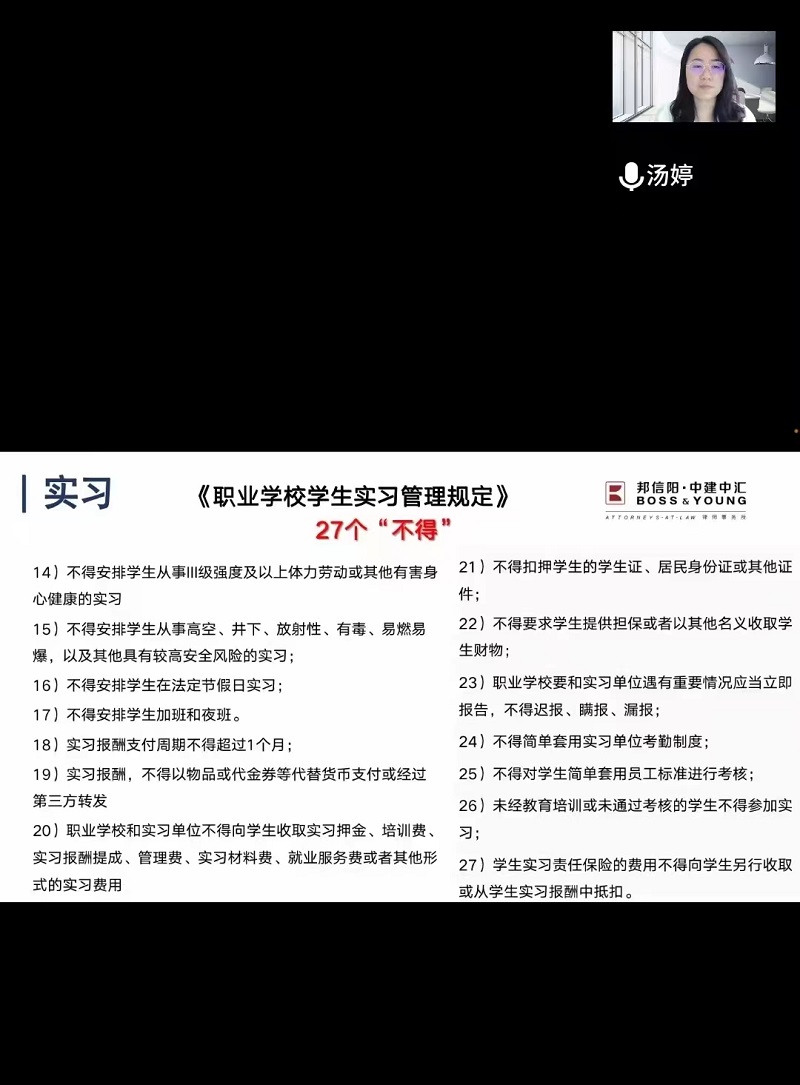 为进一步护航大学生实习就业工作,5月8日,学校邀请了上海邦信阳中建中汇律师事务所合伙人汤婷律师为大二、大三学生讲授“高职院校学生实习就业的法律风险和防范”。此次讲座由校办主任李旺老师主持,据统计500多名校内外师生在线聆听了该讲座。 讲座结束后,校办李旺老师表示,希望通过讲座帮助学生在今后实习就业过程中提高自我保护意识,树立法律维权意识,培养尊崇与遵守契约精神,不断提高自身的法治素养。(文/图:陈思思 供稿:校办)/span>
