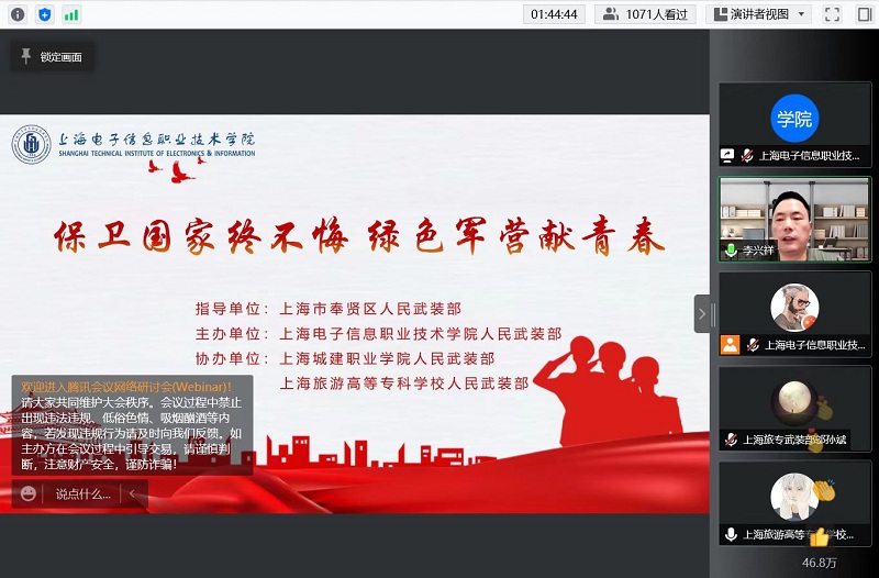 为切实加强学校大学生国防教育,吸引和鼓励/span>适龄青年/span>携笔从戎,参军报国,/span>5/span>月/span>11/span>日,学校通过云端开展了“献身国防建设,不负精彩人生”主题征兵宣传专题讲座。讲座特邀奉贤区人民武装部副部长李兴祥同志担任主讲,学校党委副书记、副校长张涛/span>/span>,/span>学校人民武装部负责人/span>出席,上海师范大学、上海电子信息职业技术学院、上海城建职业学院、上海旅游高等专科学校等/span>7/span>所高校/span>1000/span>余名师生在线观看,气氛热烈,人气爆棚,点赞热度高达/span>50/span>余万。/span>/span>/p> /span>/span>/p> 李兴祥副部长结合自身/span>32/span>年从军经历,从为什么要当兵、怎样当好一个兵、如何实现军人职业发现路径三个方面,紧扣历史与现实、结合当前和长远,明确了征兵工作时间节点和入伍流程、讲解了大学生应征入伍的各项优待政策、介绍了军人职业发展基本路径;号召同学们积极响应国家号召,踊跃报名参军入伍,将个人理想融入到强军梦、强国梦中,真正把爱国之情、强国之志转化为报国之行。讲座后,李兴祥副部长就同学们关心的体检、政治考核、免试升本等参军相关事宜进行了耐心详细地解答。/span>/p> /span>/p> 讲座由奉贤区人民武装部全程指导,上海电子信息职业技术学院人民武装部主办,上海城建职业学院人民武装部和上海旅游高等专科学校人民武装部协办,旨在提高大学生对/span>征兵政策的知晓率/span>,/span>激发大学生参军报国的热情,增强大学生爱国情怀、提升入伍内动力,为/span>2022/span>年下半年征兵工作奠定基础。/span>/span>/p> /span>/span>/p> 我校坚持把征兵工作作为一项重要的政治工作来抓,/span>坚决贯彻落实/span>“/span>一年两征/span>”/span>改革部署/span>,/span>2022/span>年上半年/span>/span>坚持提高兵员质量与抓好疫情防控两手抓/span>,向部队输送/span>53/span>名优秀青年,其中大学毕业生/span>48/span>人,占比/span>90.6%/span>。接下来,学校将进一步/span>/span>加强组织领导、健全工作机制、落实工作责任,确保高标准、高质量完成年度征兵工作任务。(供稿单位:人民武装部)/span>/p>