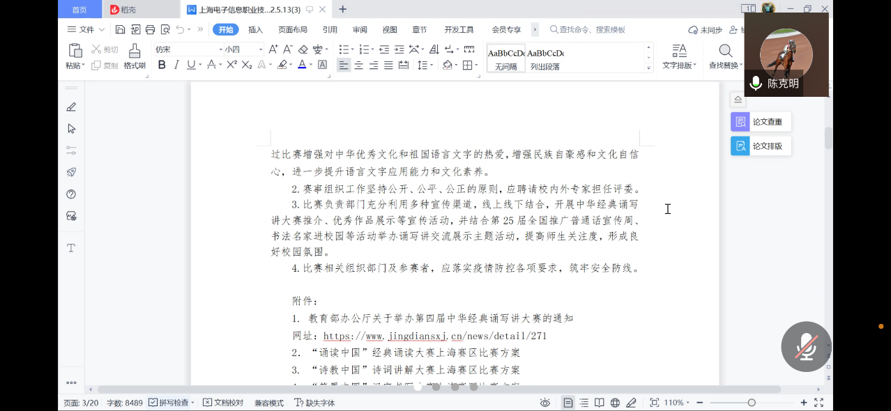 为/span>贯彻/span>落实全国语言文字会议及市语言文字会议精神,全面深入实施中华经典诵读工程,/span>校/span>语委办通过线上方式于/span>5/span>月/span>1/span>/span>4/span>日召开/span>/span>2/span>022/span>年语言文字工作专题会议。/span>/span>学校党委副书记、校长赵坚/span>,/span>学校党委副书记、副校长张涛及校语言文字工作委员会全体委员参加了会议。/span>会议由副校长/span>方林中/span>主持/span>。/span>/p> /span> /span>教务处副处长/span>王西贝/span>对/span>2/span>/span>022/span>年我校语言文字工作计划和工作进展进行了介绍,传达了/span>“/span>第四届中华经典诵读比赛/span>”/span>文件精神和参赛注意事项。/span>/span>/p> /span>/span>/p> 教务处/span>处长陈克明根据学校自身情况对/span>我校参加第四届诵写讲比赛方案进行解读,建议各部门协调配合,让/span>更多老师和学生参与到比赛之中。/span>/p> 校语言文字工作委员会/span>的各个/span>委员/span>在会上进行了热烈的交流与讨论,分享了对后续工作方式及部分工作要点的看法,还/span>提出了/span>参考/span>建议。/span>/p> 最后,校党委副书记、校长赵坚/span>指出:/span>我们/span>应该/span>以赛促教,以赛促学,让我们学校形成具有书香特色的职业教育氛围。/span>市/span>语委的各项比赛及活动应结合各部门的常规工作去开展,夯实我们学校传统文化育人的根基和厚度。/span>(/span>供稿单位:校语委办)/span>/p>