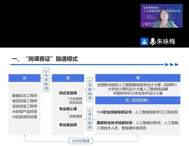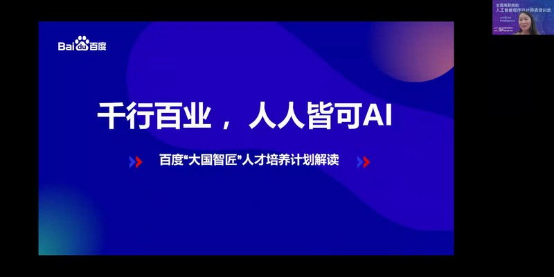 7月15日是“世界青年技能日”,为提高全社会对青年技能人才、技能就业的认可程度,营造“劳动光荣、技能宝贵、创造伟大”的时代风尚和精益求精的“工匠精神”,促进高校毕业生高质量就业。由全国人工智能职业教育集团和百度公司联合主办、上海电子信息职业技术学院承办的“第四期全国高职院校人工智能程序设计师资培训班”如期举行,来自全国各地324名职业院校老师相聚“云端”学习和研讨。/span>/span>/p> /span>/p> 我校副院长方林中出席会议并致辞。他向参加培训的教师表示热烈欢迎,并介绍了学校基本办学情况。他提出,建设技能型社会,职业教育肩负使命。他还特别谈到了数字产业化和产业数字化的关系,数字基础设施的搭建和数字技术的落地,这两个重要的支撑都离不开职业教育。在整个数字化转型过程当中,职业教育大有可为。 全国人工智能职业教育集团秘书长盛鸿宇出席开班仪式并致辞。他表示,四期培训班根据各省实际情况进行调整和更新培训内容。基于各省职业技能大赛都将互联网纳入权重指标,这也成为这次培训重点。接下来的几天会带领老师们进行快速编程体验。系列相关培训的举办希望把百度前沿技术,带给职业院校教师、带给学生,让他们更好成长。 /span>/p> 百度高校合作部副总监计湘婷,作为本次培训首讲嘉宾,以《千行百业,人人皆可AI——百度“大国智匠”人才培养计划解读》为主题,向大家介绍了百度高校合作以及人才培养经验。 /span>/p> 我校继续教育学院院长朱咏梅主持了第一天的培训,并在人工智能+X复合性人才培养实践教学环节,分享基于百度飞桨EasyDL平台的芯片质检系统。