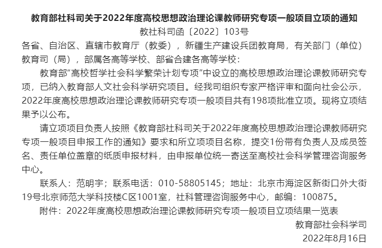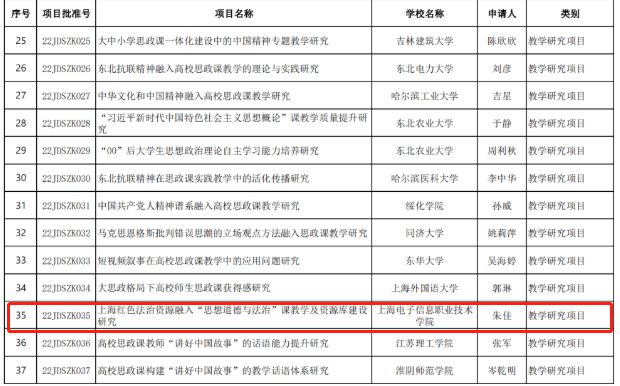 /span>/span>/strong>/p> 8月16日,教育部社会科学司发布《2022年度高校思想政治理论课教师研究专项一般项目立项的通知》。我校马克思主义学院朱佳老师的《上海红色法治资源融入“思想道德与法治”课教学及资源库建设研究》获批教学研究项目/span>,/span>资助金额/span>10万元/span>/span>。这标志着我校思想政治理论课教学改革和科研创新取得了新成效。/span> /span>/span>/p> /span>/span>/p> 近年来,我校思政学科科研水平稳步提升。这是马克思主义学院第三次获批教育部立项课题,也是朱佳老师第二次获得同类立项课题,同时也是我校上海红色文化传承研究中心成立以来成功申报的第一个省部级课题。马克思主义学院将以此为契机,支持和鼓励更多教师申报高级别课题,努力培养一支教学水平高、科研能力强的优秀教师队伍,多出高水平的科研成果,提升我校/span>“大思政课”建设成效,助力学校申本工作稳步推进。(供稿单位:马克思主义学院)/span>/span> /span>/span>/strong>/strong>