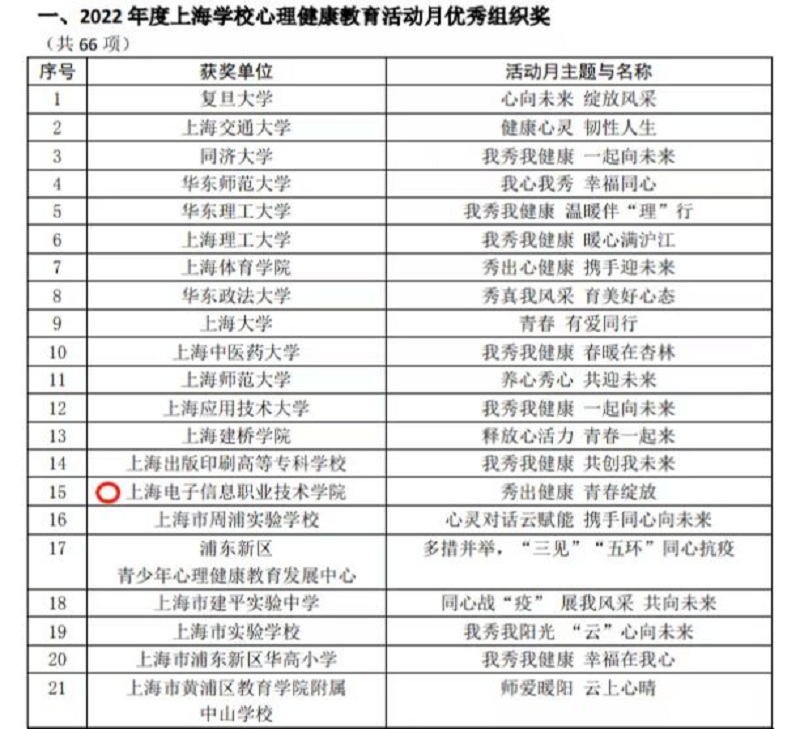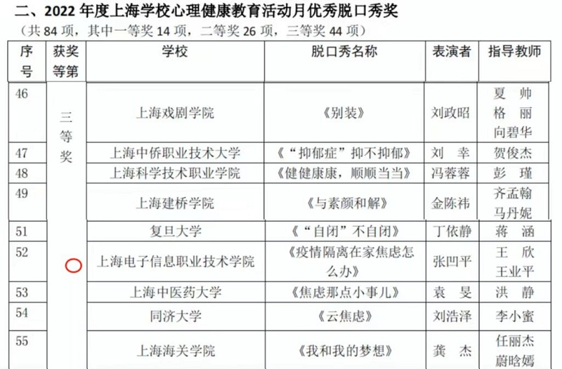 近日,由上海市教育委员会德育处指导、上海学生心理健康教育/span>发展/span>中心主办的/span>2022年上海学校“我秀我健康 一起向未来”主题心理健康教育活动月评选结果揭晓/span>/span>。/span>我校在本次活动月中表现突出,荣获/span>“/span>/strong>2022年度上海学校心理健康教育活动月优秀组织奖/span>/strong>”/span>/strong>。来自设计与艺术学院的张凹平同学凭借作品《疫情隔离在家焦虑怎么办?》荣获/span>“/span>/strong>2022年度上海学校心理健康教育活动月优秀脱口秀三等奖/span>/strong>”/span>/strong>。/span>/p> /span>/p> 在本年度心理健康教育活动月中,/span>我/span>校坚持/span>“育心”与“育德”相结合,/span>/span>着眼疫情防控准封闭管理实际,回应学生实际需要,/span>疏解学生心理困扰,/span>全力/span>守护学生心理健康/span>。/span>学校心理健康教育与咨询中心/span>以/span>“秀出健康/span>/span> /span>青春绽放/span>”为主题,面向全体学生开展心理健康教育与宣传活动/span>/span>,活动月分/span>为/span>守护篇、成长篇、绽放篇三个篇章展开/span>,/span>鼓励同学们以各种方式进行创意表达,秀出自我,秀出健康,绽放青春光芒。/span>/p> 活动/span>月/span>期间,/span>各二级学院充分发挥二级心理工作站作用,分别组织/span>“慧心绘色/span> /span>秀出自我/span>”自画像比赛、“微分享/span>/span> /span>心交流/span>”短视频评比、“突破自我/span>/span> /span>强国有我/span>”主题心理健康教育班会、“激扬青春活力/span>/span> /span>让生命流光溢彩/span>”校园摄影作品大赛、“声入人心 互诉心声”创意配音征集比赛、“我秀我健康/span>/span> /span>一起向未来/span>”脱口秀大赛、“健康向未来/span>/span> /span>秀出我心晴/span>”诗歌朗诵比赛、“‘鹭’力同心”心理委员知识技能大赛等/span>/span>活动,活动吸引了/span>6/span>000余名学生积极参与,对准封闭管理期间的在校学生完成全覆盖。/span>/p> /span>/p> 张楠楠心理名师工作室/span>邀请校外专家,面向心理专兼职教师、辅导员队伍、学生等先后开展/span>6次专题讲座,有效提升了学生工作队伍在准封闭管理期间的心理工作能力,引导学生树立积极正向的抗“疫”心态。学校心理专兼职教师/span>/span>录制/span>5堂/span>“守护‘疫’心”系列心理健康教育微/span>课堂,《关于知道,做不到》《疫情期间,生活作息乱了怎么办?》《在寝室无法静下心学习怎么办?》《准封闭期间,如何发现自己状态不佳?》《准封闭期间,在宿舍待着无聊怎么办?》,课程针对性强,具有较强的指导价值。同时,积极利用/span>“鹭洲学畔”公众号推送心理健康教育知识和活动,以图文/span>、/span>视频等学生喜闻乐见的形式/span>宣传心理健康知识/span>,相关推文累计浏览量突破/span>7000人次。/span>/span>/p> 活动月期间,学校结合准封闭管理的实际需要,安排心理专兼职教师驻校值守,在网格化管理人员中统筹安排心理兼职辅导员入驻学生宿舍,在线上开通/span>24小时心理服务热线,/span>/span>提供线上线下/span>相结合的/span>心理咨询和辅导服务/span>300/span>/span>余/span>人次/span>,/span>保障了学生的心理健康和学校的安全稳定/span>。/span>后续,学校心理健康教育与咨询中心将进一步创新工作载体,深入推进/span>“五位一体”心理育人工作体系建设,引导广大青年学生健康成长、全面发展/span>/span>。(供稿单位:学生处)/span>/p>