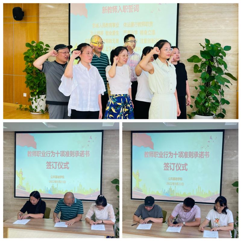 活动伊始,学院副书记朱清结合学校关于开展“师德师风建设月”活动的相关要求,向与会老师介绍了学院开展“师德师风建设月”活动的目的和内容。接着,罗光霞老师作为领誓人,带领全体新教师庄严宣誓,铿锵誓言表达了教师恪守师德、坚守底线,为教育事业无私奉献的决心。随后,朱清副书记对《教师职业行为十项准则》进行了解读,列举了违反师德师风的现象、案例并分析了产生的根源。紧接着,新进教师集体签署了《教师职业行为十项准则承诺书》。这份承诺承载着一份责任、一份使命、一份决心、一份信念。签署结束后,学院对过去一年来在各级各项比赛、科研成果及教学工作中成绩突出的老师们进行了表彰。