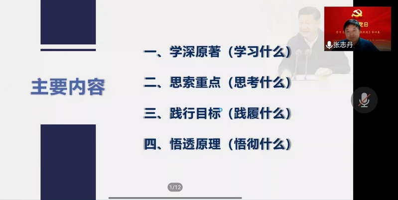 为深入学习贯彻党的十九届六中全会精神,进一步学深悟透习近平新时代中国特色社会主义思想,以更加昂扬的姿态迎接党的二十大胜利召开,根据学校党委的有关工作要求,马克思主义直属党支部于/span>9/span>月/span>21/span>日晚上通过腾讯会议平台开展了学习《习近平谈治国理政》第四卷主题党日活动,本次主题党日活动邀请了上海师范大学马克思主义学院院长张志丹教授对《习近平谈治国理政》第四卷进行了导读,会议由马克思主义学院直属党支部副书记江龙主持。马院全体党员教师参加了学习交流。/span>/span>/p> /span>/p> 江龙副书记首先强调,学习《习近平谈治国理政》第四卷是当前一项重大政治任务,也是我们马院在本学期开展《习近平新时代中国特色社会主义思想概论》必修课的集体学习活动,并简要介绍了张志丹教授的学术履历。/span>/p> /span>/p> 在导读部分,张志丹教授从学深原著、思索重点、践行目标、悟透原理四个方面对《习近平谈治国理政》第四卷进行了研读。他先介绍了总体框架,指出了政治建设在其中的突出地位,讲到/span>“两个革命”的辩证关系,又从“掌握历史主动,在新时代更好坚持和发展中国特色社会主义”讲到“全人类共同价值和上海精神”。张教授的导读让我们从理论与实践相统一、历史与现实相贯通、国内与国际相结合上深化了对习近平新时代中国特色社会主义思想开辟马克思主义发展新境界、实现马克思主义中国化新的飞跃理解和认识。/span>/span>/p> 在交流环节,马院党员教师们就《习近平谈治国理政》第四卷的鲜明特点以及如何开展好《习近平新时代中国特色社会主义思想概论》必修课等问题与张志丹教授进行了深入交流。/span>/p> /span>/p> 最后,江龙副书记要求我们以此次学习为契机,进一步深刻领会习近平新时代中国特色社会主义思想的精髓要义,为马院在本学期开展《习近平新时代中国特色社会主义思想概论》必修课做好更加充分的准备。马院党员教师也纷纷表示通过本次思想理论学习,进一步加深了对习近平新时代中国特色社会主义思想的理解,增强了上好《习近平新时代中国特色社会主义思想概论》必修课的信心。(作者:刘学飞 供稿单位:马克思主义学院直属党支部)/span>/p> /p>
