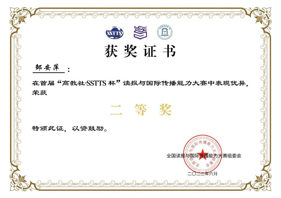 日前,首届“高教社·SSTTS杯”全国读报与国际传播能力大赛获奖名单揭晓。我校2021级应用英语专业学生邹安萍获决赛二等奖,徐晓莉获优秀指导教师奖。/p>