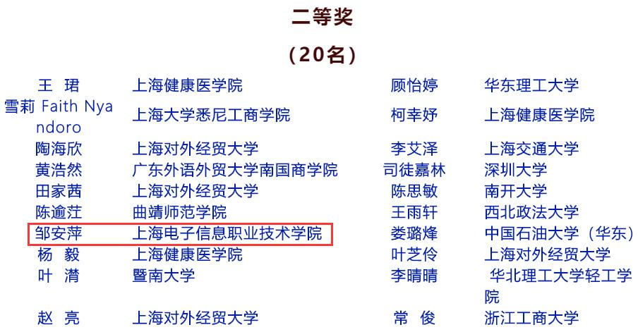 该赛事由高等教育出版社和上海市科技翻译学会主办,旨在培养我国大学生扎实的英语语言基础、跨学科知识和人文科学知识,培养具备各领域国际交流能力、能够讲好中国故事的高素质复合型人才。来自全国近500余名高职、本科、研究生以及部分社会人士和留学生参加了比赛。经过评委严格评审,最后仅30名选手进入决赛。在徐晓莉老师的悉心指导下,邹安萍一路过关斩将,脱颖而出,获得佳绩,是唯一一位来自高职院校的获奖选手。/span>/p>