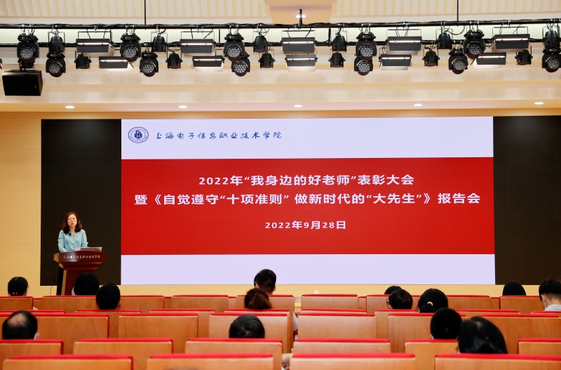 928日,学校在奉贤校区C108召开2022年“我身边的好老师”表彰大会暨《自觉遵守“十项准则” 做新时代的“大先生”》报告会。学校党委书记田钦,党委副书记、纪委书记毛玉婷、宣传部部长张贯彻、各二级学院书记、教学副院长、教师代表等出席本次会议。教师工作部部长、人事处处长张峻颖主持会议。