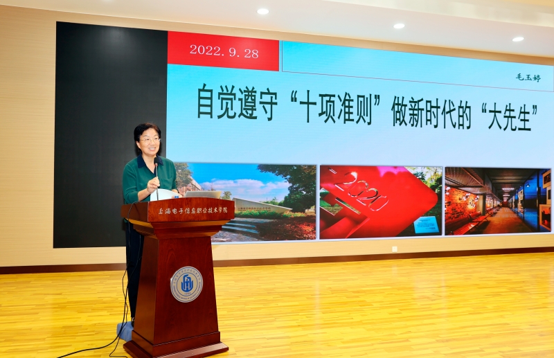 学校党委副书记、纪委书记毛玉婷作题为《自觉遵守“十项准则” 做新时代的“大先生”》报告。她从“十项准则”出台的背景、意义以及“十项准则”的内容,对《新时代高校教师职业行为十项准则》主要内容向教职工作详细解读。她指出,高校教师承担着教书育人光荣使命,十项准则能让教师进一步明确新时代高校教师职业规范,也为教师严格自我约束、规范职业行为、加强自我修养提供基本遵循。她提出,希望广大教师要以德立身,见贤思齐,不断提高道德、修养水平,完善自己的人格品质。每位教师都要自觉遵守“十项准则”,努力做新时代的大先生。大力弘扬尊师重教的社会风尚,推动我校形成优秀人才竞相从教、尽展其才、好老师不断涌现的良好局面,以高度的责任感、使命感,为办好高质量教育和人民满意的教育作出新的更大的贡献。(供稿单位:教师工作部 文/胡燕 图/傅娟)