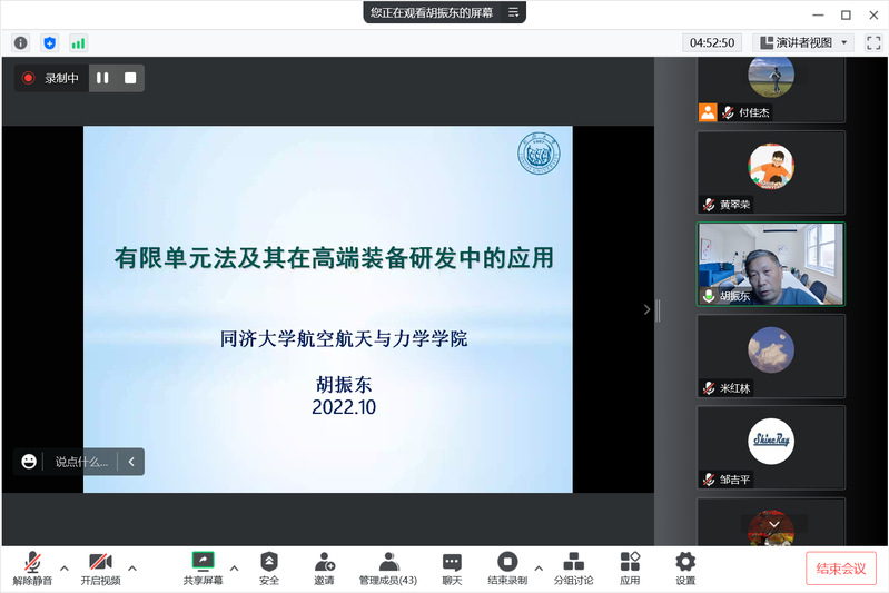 下午,胡振东教授从“有限元到底是什么方法”切入,为大家介绍了有限元法的构造原理、等参单元与奇异单元等内容,并结合在研课题展示了有限元法在高端装备研发中的应用实例。