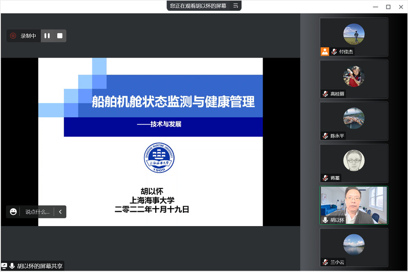 胡以怀教授讲述了船舶机舱的性能监测、振动监测、油液监测等技术,并提出了对未来船舶机舱研究的设想。