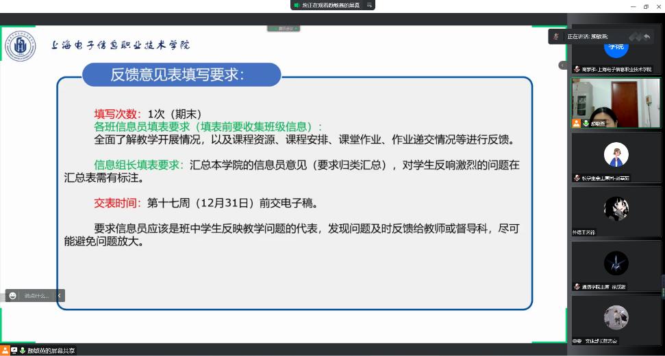 1212日,教务处通过线上方式召开了学生教学信息员组长会议。会议由教务处教学督导科科长颜敏燕主持,教务处见习师高梦雅、校学生教学信息员主席、校(院)学生教学信息组长出席了会议。