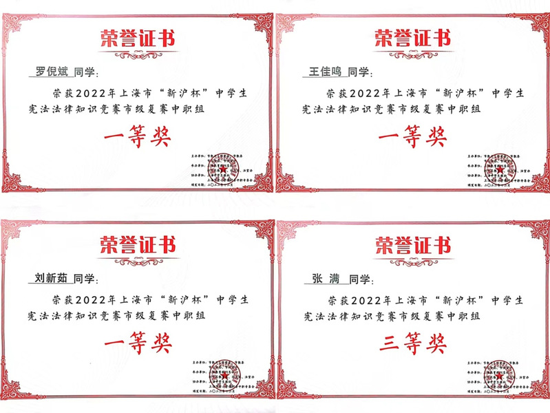 我校高度重视“新沪杯”中学生宪法法律知识竞赛,在马克思主义学院、贯通学院的通力配合下,在班主任老师大力支持下,梁艳和张国红两位辅导教师全力以赴,指导学生认真系统的学习了宪法、刑法、民法、未成年人保护法等几十部法律法规。四位参赛学生克服时间紧、内容多、挑战性强等困难,咬牙坚持,相互鼓励打气,共同研究探讨。经过四个多月的备赛,在我校师生共同努力拼搏下,最终以全场第二名的好成绩勇夺本届“新沪杯”决赛团体银奖。
