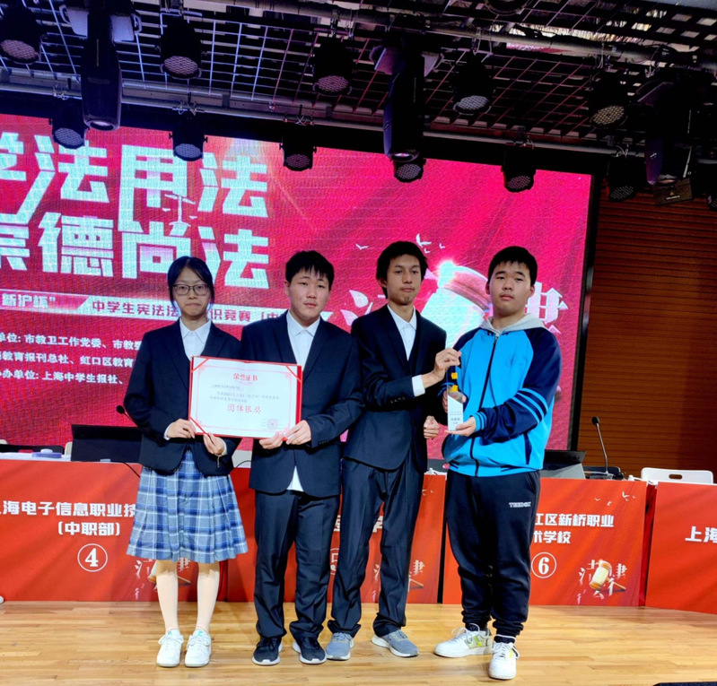 12月9日,我校五年一贯制学生在由上海市教卫工作党委、上海市教委、上海市司法局、上海市法宣办主办的2022年上海市“新沪杯”中学生宪法法律知识竞赛中,喜获得中职组决赛团体银奖的好成绩。