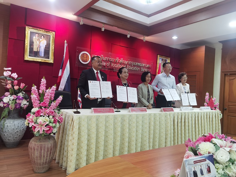 8月21日,团组抵达泰国,旋即赶往泰国教育部职业教育委员会曼谷职教中心,就中泰申谷学院国际合作办学事宜进行研讨。曼谷职教中心主席斯里潘、主任冲普努、曼谷各职业院校校长等出席会议。中泰双方总结了中泰申谷学院办学经验,对过去几年彼此的工作及付出的努力均表示十分赞赏,并就下一步继续加深教育合作达成共识。在斯里潘主席的见证下,张涛副书记与曼谷职教中心主任冲普努、民武里技术学院校长塔威萨克、唐风国际教育集团泰国分公司董事李林美蓉签署四方合作协议,决定继续加强国际合作办学各领域交流合作,为服务“一带一路”共建、在泰“走出去”中资企业及泰国经济发展培养更多更优秀的本土化专业技术人才。