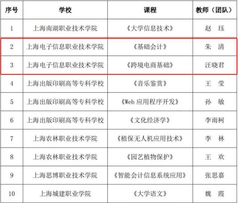 在上海市高职高专课程思政与文化素养教育教学指导委员会组织的“2023年度上海市高职高专课程思政示范课程、教学名师和示范团队”的申报中,我校朱清老师《基础会计》课程、汪晓君老师《跨境电商基础》课程获得立项。