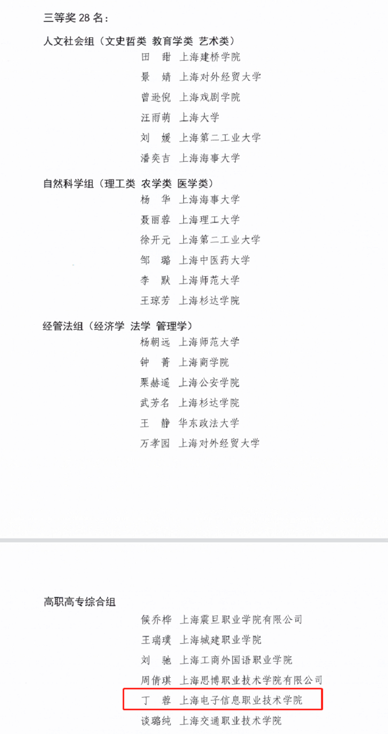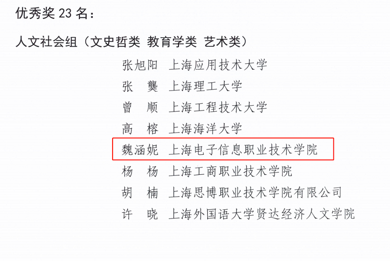 我校精心策划,广泛动员,鼓励和支持教师参与课程思政建设项目,积极组织各类课程思政评选,经过设计、展示、指导、打磨等多个环节,最终取得了一定的成果。在第三届“上海高校青年教师培养资助计划”课程思政教学案例展演活动中,我校获得优秀组织奖,青年教师丁蓉、魏涵妮分别获得高职高专综合组三等奖、人文社科组优秀奖。