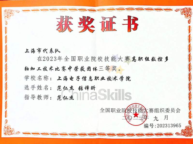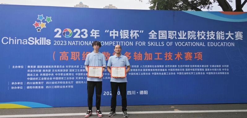9月24日至27日,2023年全国职业院校技能大赛高职组数控多轴加工技术赛项在四川工程职业技术学院举行,来自全国各地的55支团队参赛。我校机械学院教师范仁杰和学生张译昕组队,作为上海市代表队之一参赛。经过激烈角逐,我校代表队荣获团体三等奖。