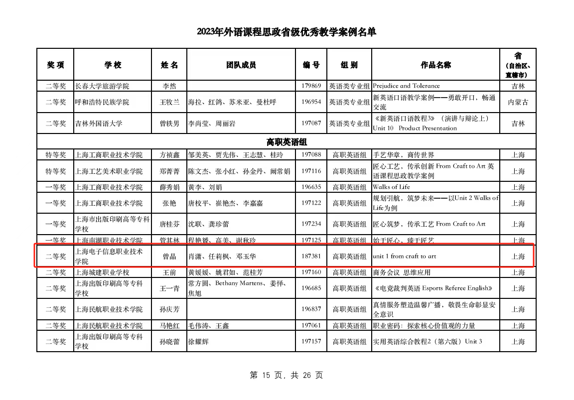 近期,高等教育出版社、全国高校教师网络培训中心和中国外语编辑部共同开展了2023年外语课程优秀教学案例征集与交流活动。通过初赛选拔、省级遴选以及全国复赛,我校外语学院曾晶、肖潇、任莉枫和邓玉华团队成功斩获省级高职英语组优秀教学案例二等奖。