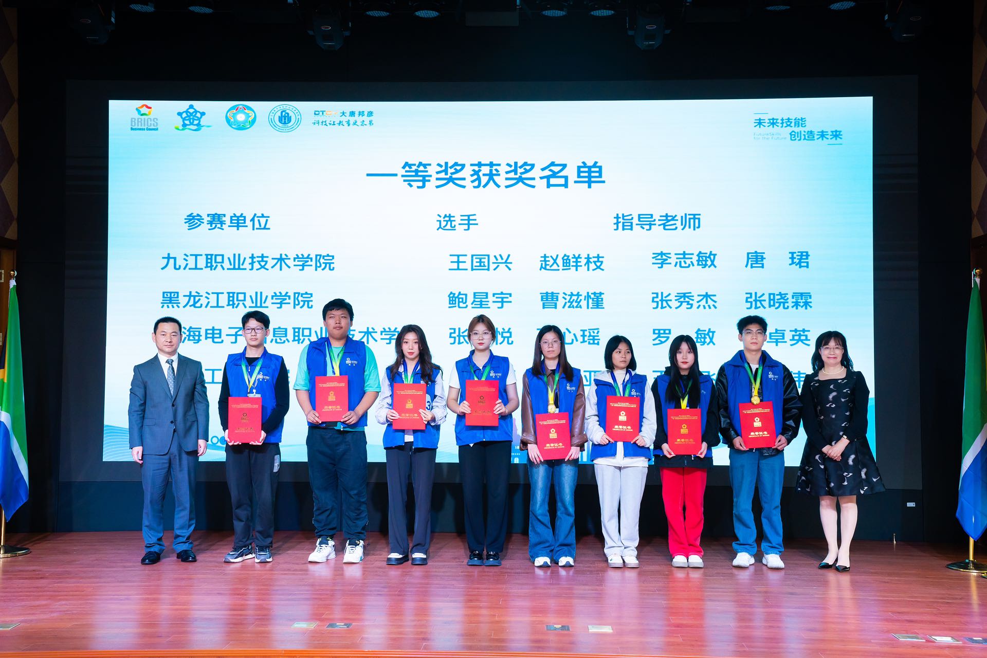 10月29日,比赛闭幕式在我校举办。金砖国家工商理事会技能发展与技术创新大赛组委会执委会竞赛处主任程帅,上海市教育委员会教育技术装备中心书记、副主任周齐佩,我校党委副书记、院长赵坚,上海工商职业技术学院副校长李向明,上海市软件行业协会副秘书长沈颖,上海市高等职业院校电子信息大类专业教学指导委员会秘书长贾璐,上海市教育委员会教育技术装备中心职教装备管理科副科长尹怡楠,大赛裁判长中国移动通信集团有限公司高级工程师徐磊,大赛技术支持单位大唐邦彦(上海)信息技术有限公司总经理程熙熙出席闭幕式。