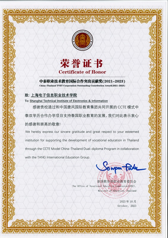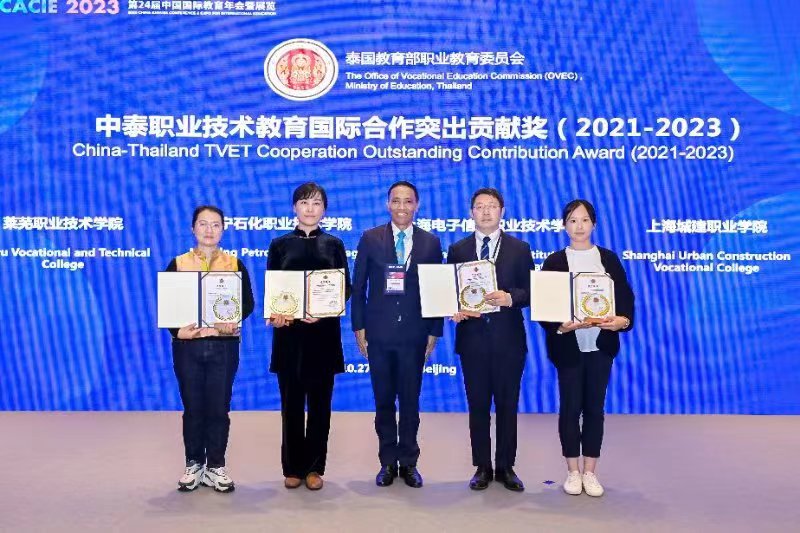 我校参加了“教育数字化背景下的国际产教合作论坛”。该论坛为深入贯彻落实习近平总书记提出的“要推进教育数字化,建设全民终身学习的学习型社会、学习型大国;要统筹职业教育、高等教育、继续教育协同创新,推进职普融通、产教融合、科教融汇;要推进高水平对外开放”重要指示,推动共建“一带一路”高质量发展,推进国家教育数字化战略行动,深化产教融合、校企合作。在此次大会中我校荣获泰国教育部职业教育委员会颁发的中泰职业技术教育国际合作突出贡献奖。