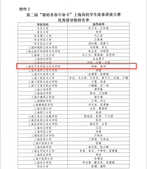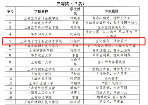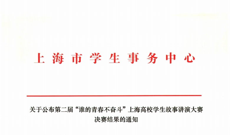 近日,由上海市学生事务中心举办的第二届“谁的青春不奋斗”故事讲演大赛结果揭晓。我校通信与信息工程学院张经纬同学荣获三等奖,通信与信息工程学院胡婷、学生工作部杨洋两位老师荣获优秀指导教师荣誉称号。