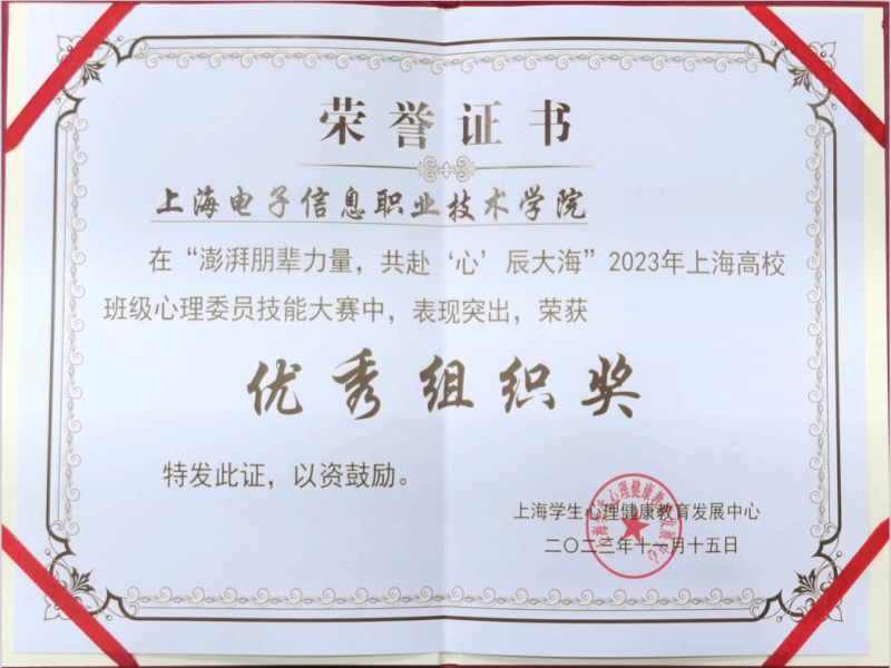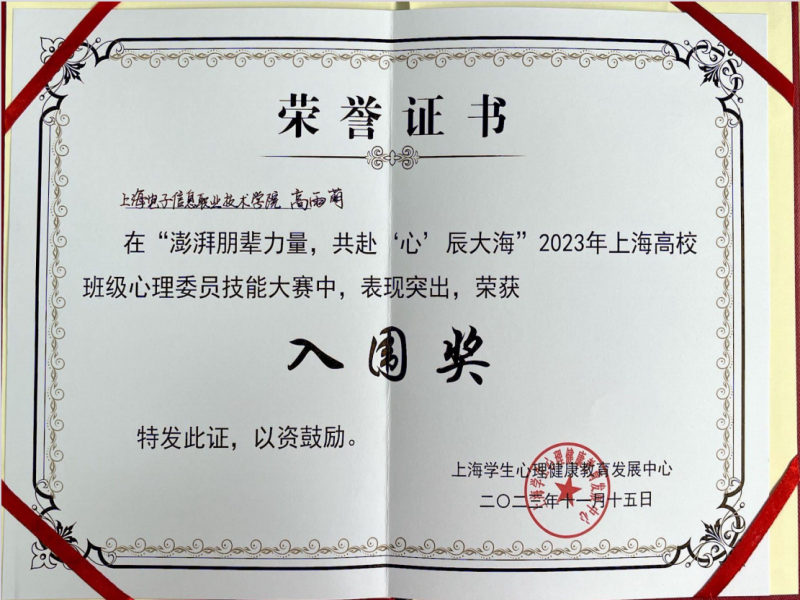 11月15日,由上海市教育委员会指导、上海学生心理健康教育发展中心主办、上海应用技术大学承办的2023年上海高校班级心理委员成长训练营结业盛典暨技能大赛在上海应用技术大学举行。我校作为全市唯一入围决赛的高职院校,最终荣获两个奖项:通信与信息工程学院22通信1班高雨萌荣获入围奖(指导老师:陈梅),学校荣获优秀组织奖。