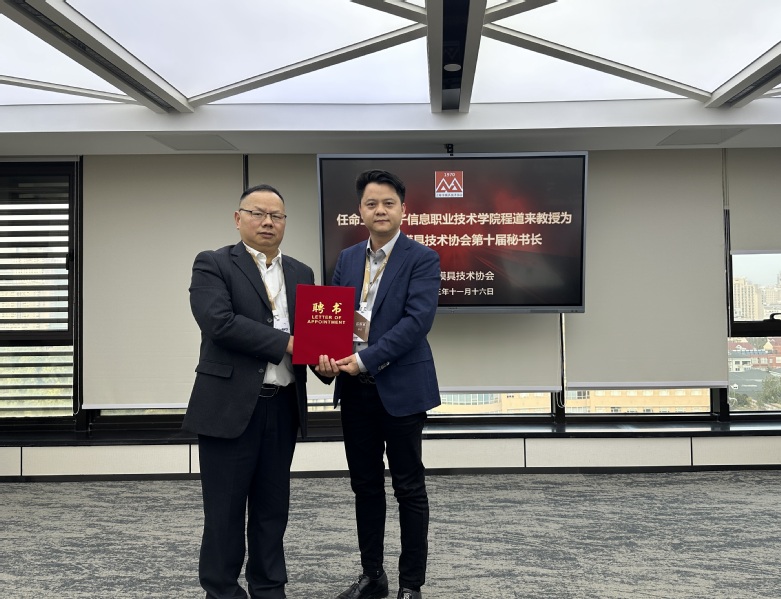 在上海市模具技术协会第十届第三次理事会环节,选举我校程道来教授为上海市模具技术协会第十届秘书长,上海市模具技术协会第十届会长彭新开为程道来教授颁发聘书。