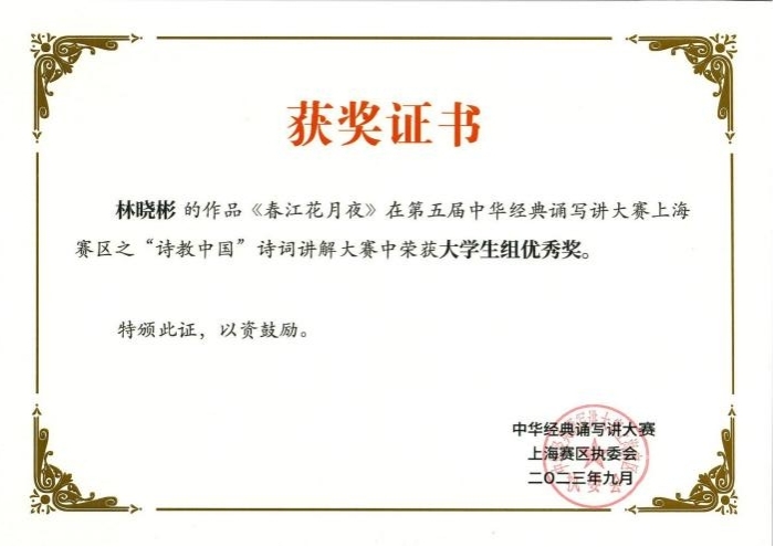 林晓彬同学的讲解作品《春江花月夜》(指导教师赵瑾)获大学生组优秀奖。