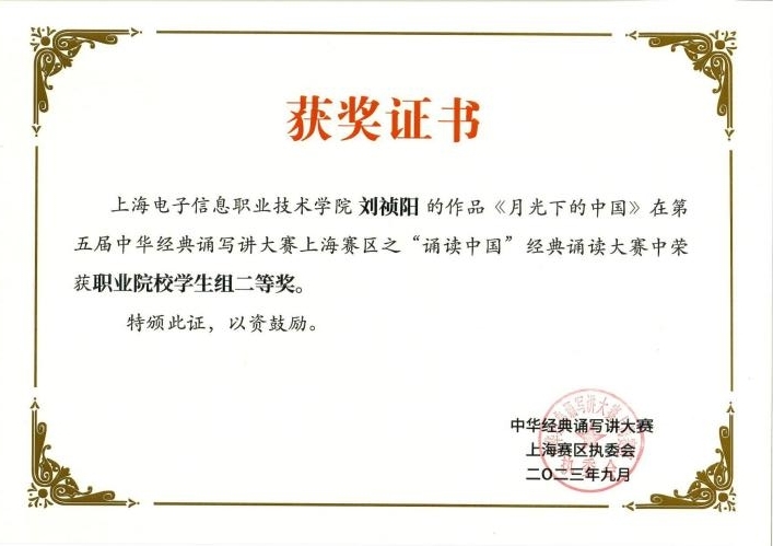刘祯阳同学的诵读作品《月光下的中国》(指导教师尹立军)获职业院校学生组二等奖。
