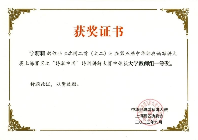 宁莉莉老师的讲解作品《沈园二首(之二)》获大学教师组一等奖。