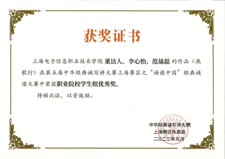 董达人、李心怡、范晟磊三位同学的朗诵作品《燕歌行》(指导教师马红莉、孙丽丽)获职业院校学生组优秀奖。